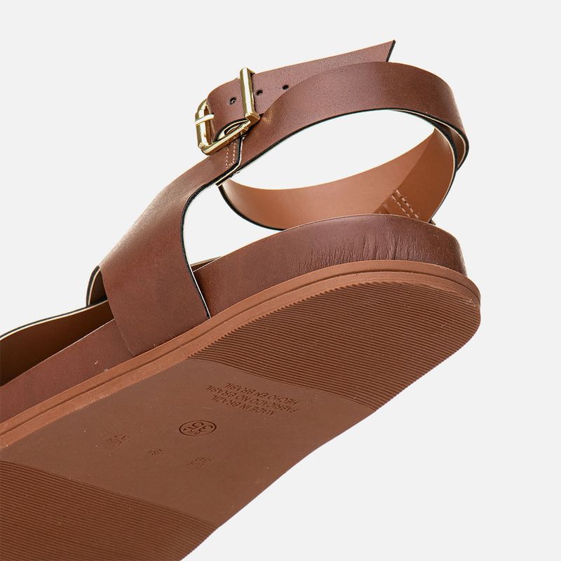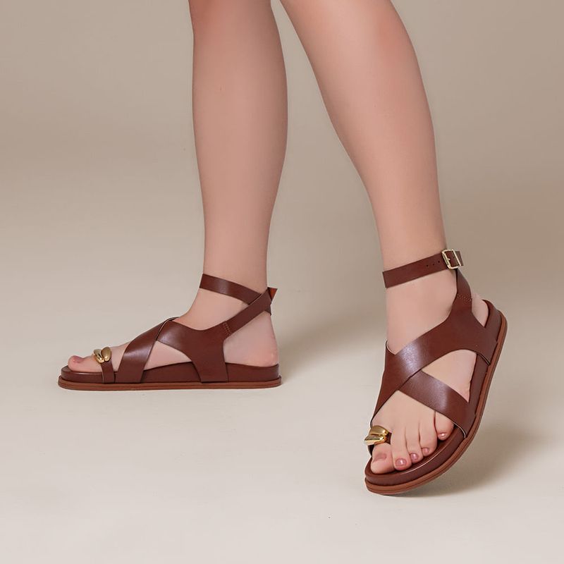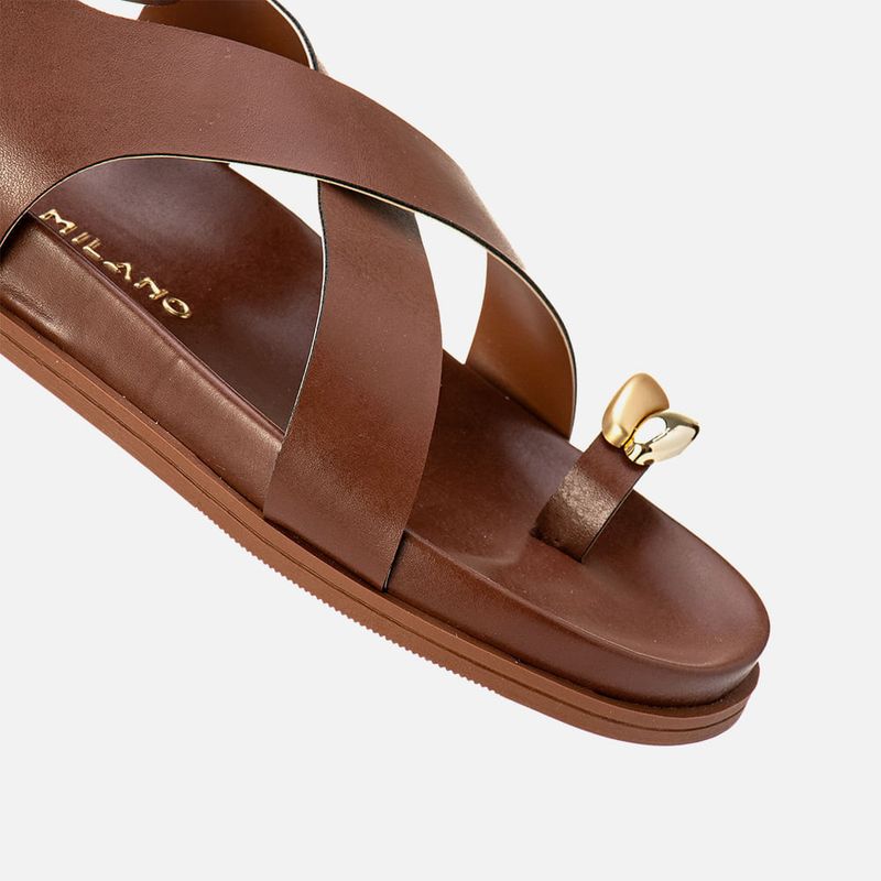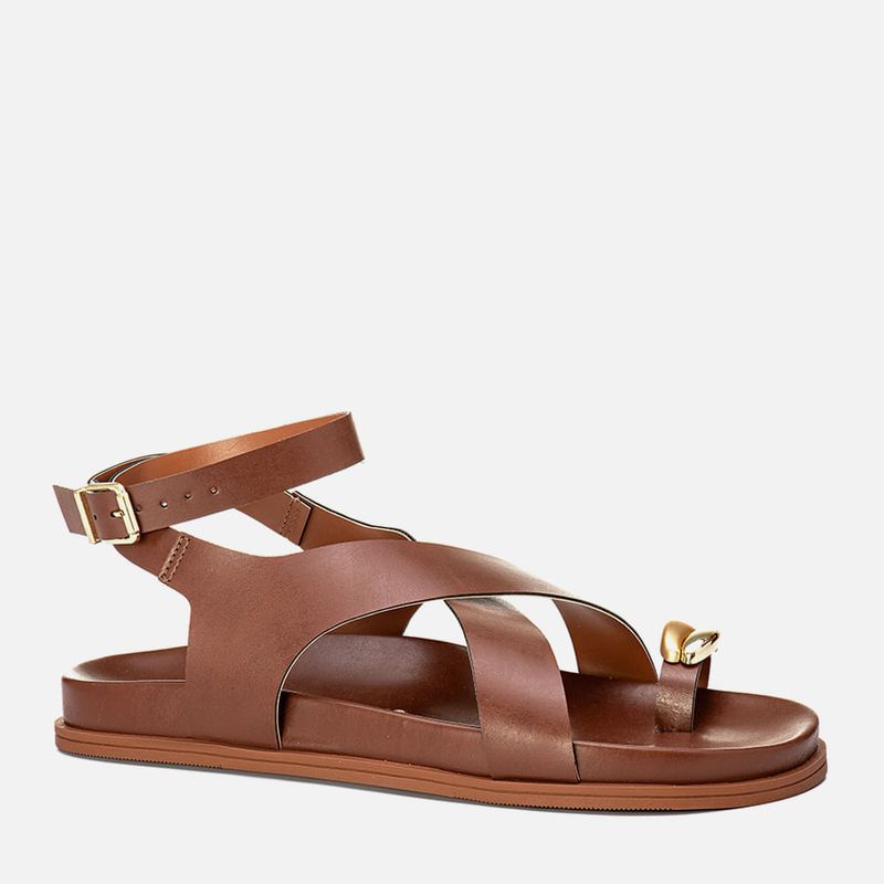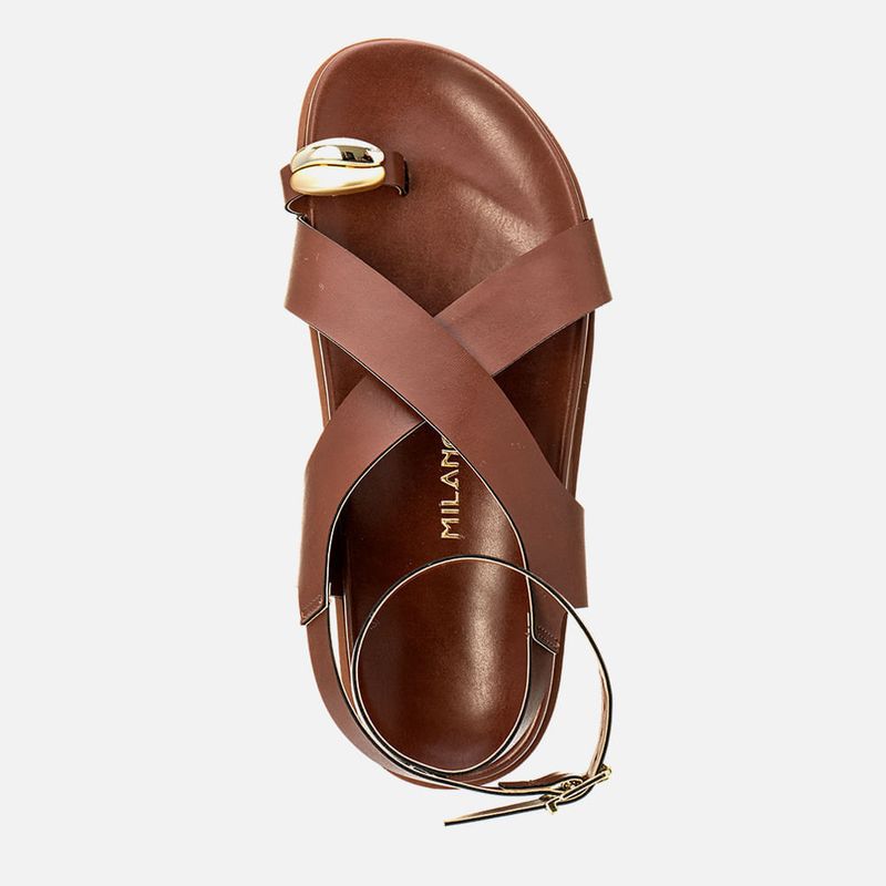 Sandália Papete com Palmilha Arredondada Anatômica Ring Toe ou Anel de Dedo com Peça Orgânica Metalizada Cromada e Fosco e Tiras Largas Cruzadas no Pé na cor Off White. Com solado emborrachado liso na cor caramelo, palmilha revestida em napa com formato anatômico – traseira e bico arredondados, tira achatada dividindo o dedão tipo ring toe – ou anel de dedo ou dedeira, e tiras largas cruzadas em X no peito do pé e fixadas em diagonal na lateral do tornozelos, essa mesma tira é cruzada no calcanhar e tornozelo com fechamento por fivela, para ajuste e regulagem do calce, todas as tiras tem forração em napa caramelo. A palmilha tem a marca Milano aplicada em etiqueta 3D na cor dourada.
