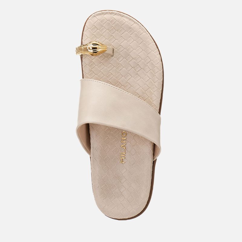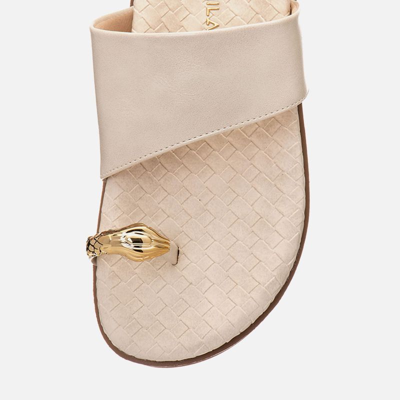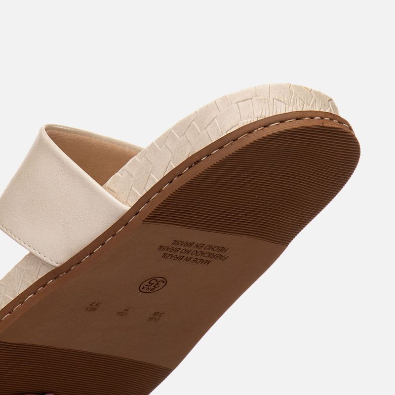 Sandália Papete com Ring Toe ou Anel de Dedo com Aplicação de Peça Metalizada com Formato de Cobra Dourada e Palmilha Revestida em Napa Tramada tipo Tressê na cor Off White. Com solado emborrachado na cor caramelo com detalhe em costura na vira oversize aparente, palmilha macia encaixada com altura média e formato anatômico, revestida em napa tramada tipo tressê com traseira e bico arredondados, tira fina achatada em napa lisa dividindo o dedão com aplicação de peça com formato de cobra na cor dourada e tira larga sobre a base do tornozelo – esta tira sai mais larga da parte interna do pé e fica mais fina na parte externa. A papete é aberta na traseira de calce prático e a palmilha tem a marca Milano aplicada em etiqueta 3D na cor dourada.