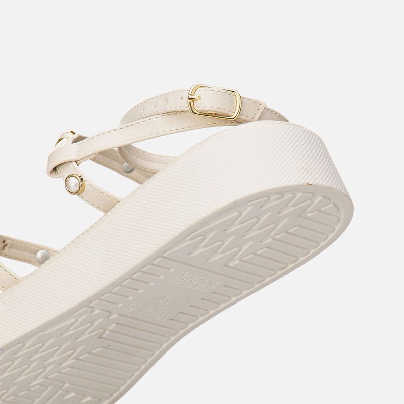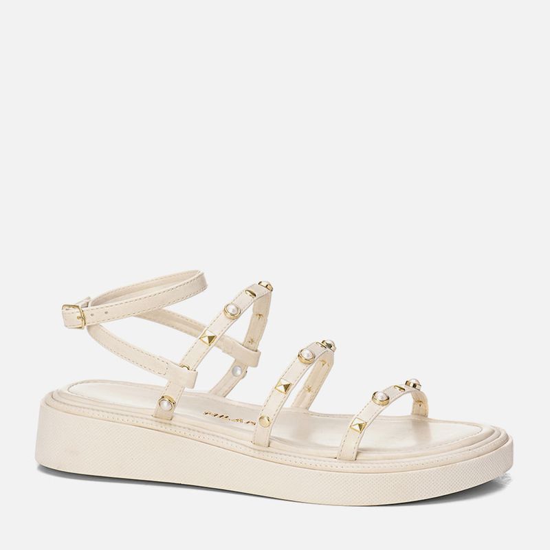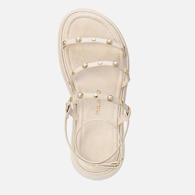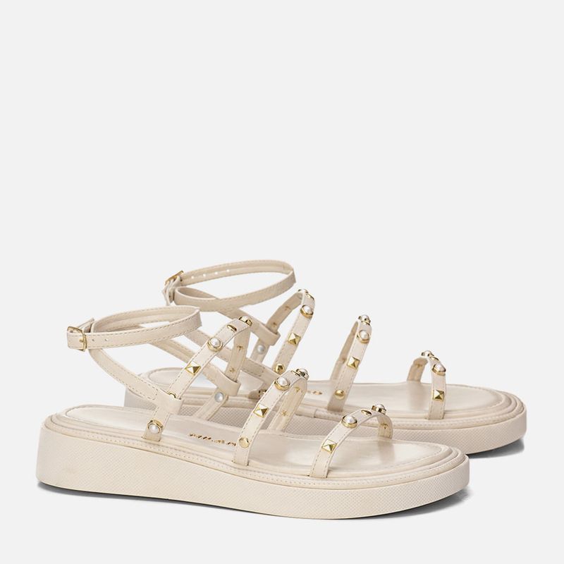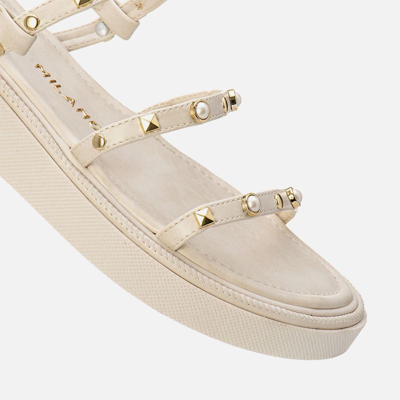 Sandália Papete Sola Alta em Estilo Boho com Aplicações em Metal de Tachas ou Studs tipo Spike de Pirâmide e Pedrarias Resina em Meia Esferas na cor Off White. Com solado emborrachado tipo flatform alta levemente anabelado, detalhe na parte superior tipo vira texturizada, palmilha ultra macia encaixada na forma com contorno interno em costura pesponto, traseira e bico arredondados, grupo de tiras finas achatadas sobre os dedos, peito do pé e base do tornozelo, as tiras tem aplicação em tachas de metal tipo spike de pirâmide em metal pequeno na cor dourada e em metal arredondado com meia esfera em pedraria de resina no mesmo tom do produto, o fechamento é feito pela tira fixada na tira do tornozelo cruzada no calcanhar com ajuste e regulagem do calce por fivela. A palmilha tem a marca Milano aplicada em etiqueta 3D na cor dourada.