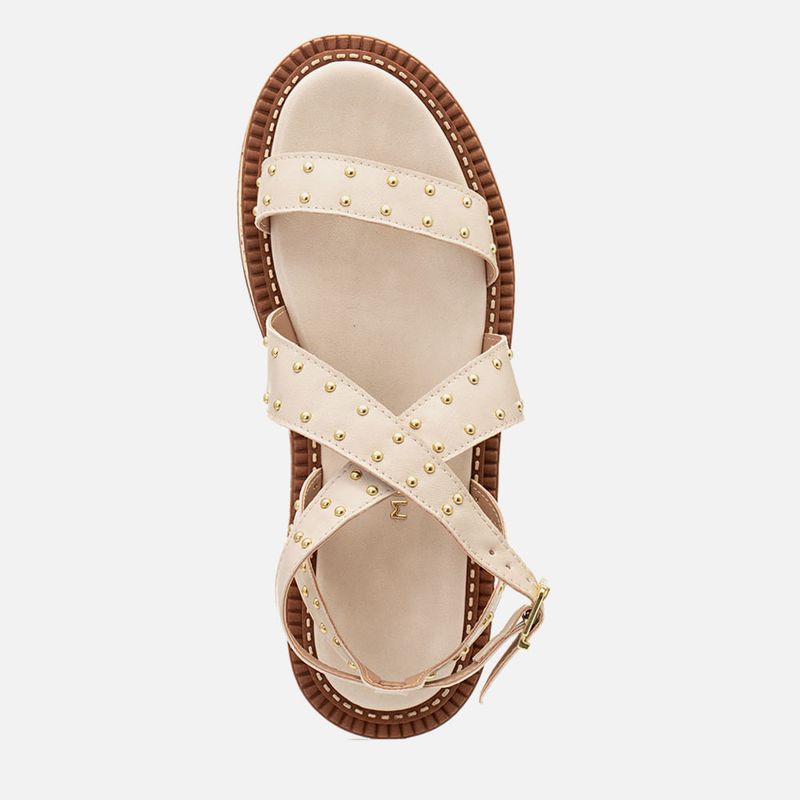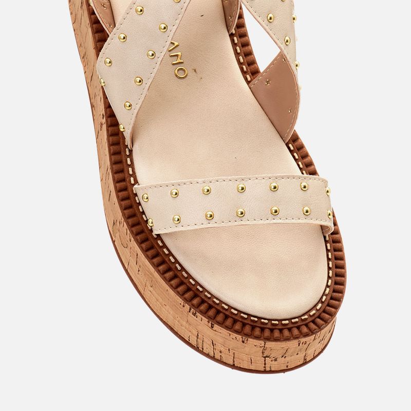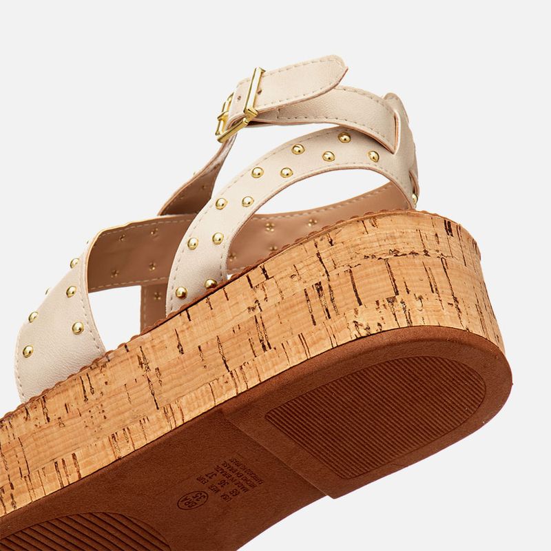 Sandália Papete com Sola Alta Plataforma em Cortiça Natural com Vira Aparente e Tiras Médias Cruzadas Estilo Boho Com Aplicação de Metal em Tachas Rebite na cor Off White. Com solado emborrachado na cor caramelo, sola alta tipo plataforma/cepa revestida em material com visual natural e artesanal tipo cortiça, com detalhe em vira texturizada na cor marrom, palmilha encaixada com detalhe tipo costura pesponto, super macia e acolchoada, tiras médias achatadas com acabamento em contorno de costura pesponto em todas as tiras, sendo: uma sobre os dedos, duas saindo da lateral do peito do pé e cruzada em X até a traseira, onde uma tira cruza o calcanhar e é fixada nessa tira frontal – as tiras tem aplicação de metais em tachas tipo rebite pequeno na cor dourada, o fechamento é feito em fivela grande na cor dourada – permitindo a regulagem e ajuste do calce. A palmilha tem a marca Milano aplicada em etiqueta 3D na cor dourada.