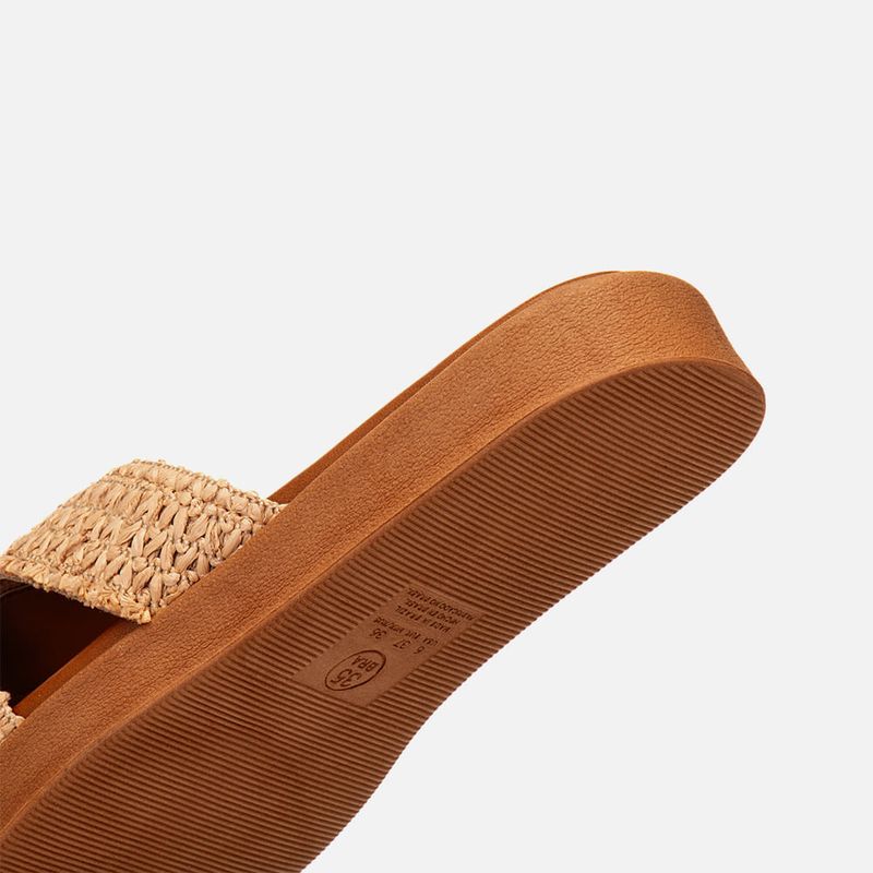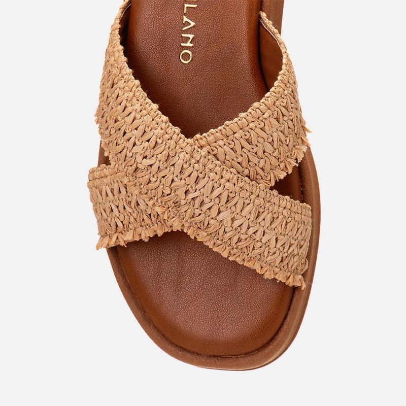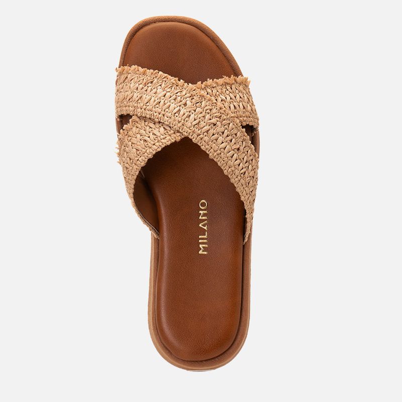 Sandália Papete com Sola Alto e Tira Cruzada em X em Material Tramado Natural na cor Caramelo. Com solado emborrachado com sola alta com formato oversize tipo vira aparente, palmilha encaixada super macia e acolchoada com traseira e bico arredondado, duas tiras largas cruzadas em X no peito do pé feitas em material tramado natural tipo tressê com interior forrado em napa. A palmilha tem a marca Milano aplicada em etiqueta 3D na cor dourada.