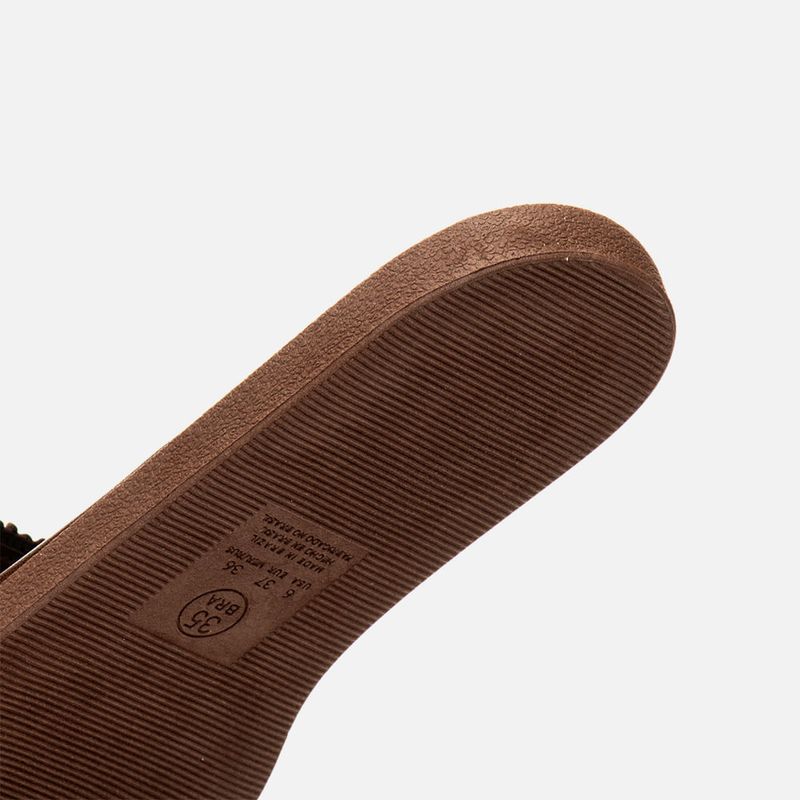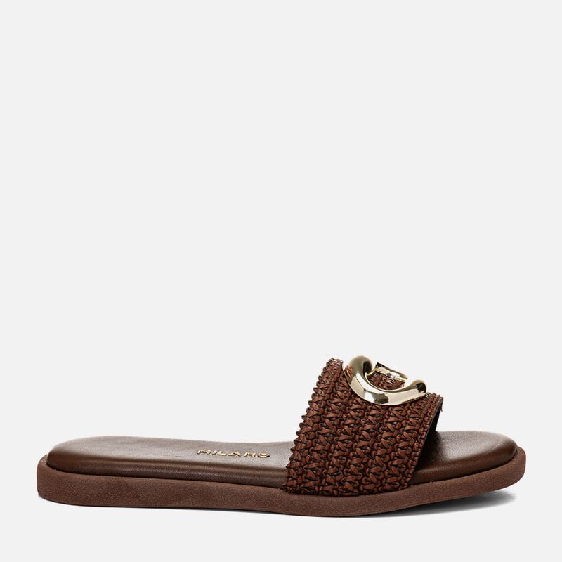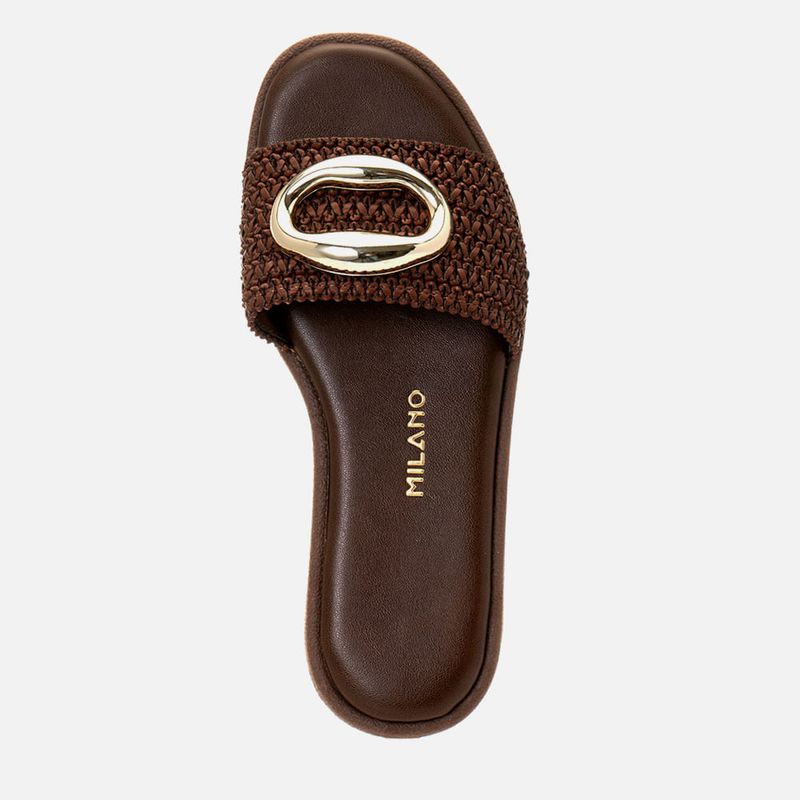 Sandália Papete com Sola Média e Tira tipo Slide em Material Tramado Natural com Aplique em Peça com Formato Orgânico Metalizada Dourada na cor Café. Com solado emborrachado com sola média, palmilha encaixada super macia e acolchoada com traseira e bico arredondado, tira larga tipo slide feita em material tramado natural tipo palha com aplique no peito do pé em peça metalizada em fivela com formato orgânico na cor dourado cromado. A palmilha tem a marca Milano aplicada em etiqueta 3D na cor dourada.