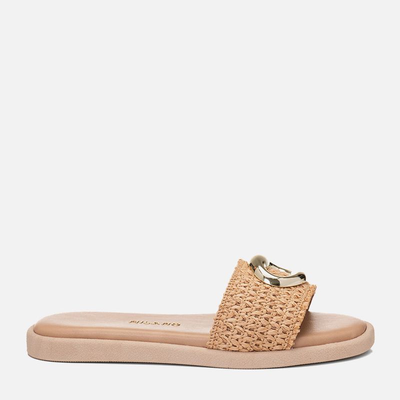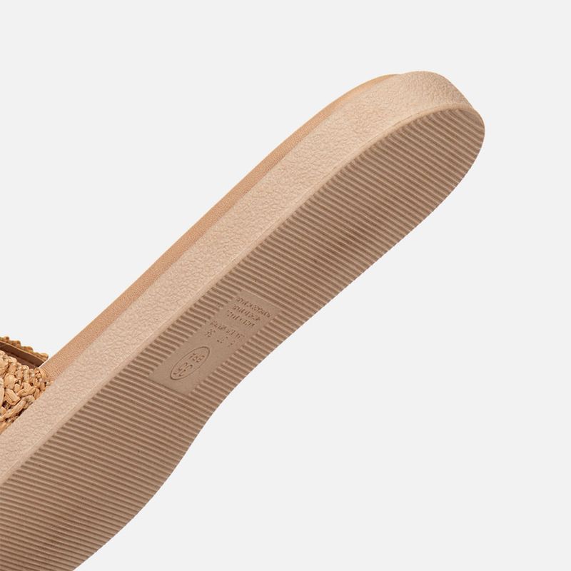 Sandália Papete com Sola Média e Tira tipo Slide em Material Tramado Natural com Aplique em Peça com Formato Orgânico Metalizada Dourada na cor Café. Com solado emborrachado com sola média, palmilha encaixada super macia e acolchoada com traseira e bico arredondado, tira larga tipo slide feita em material tramado natural tipo palha com aplique no peito do pé em peça metalizada em fivela com formato orgânico na cor dourado cromado. A palmilha tem a marca Milano aplicada em etiqueta 3D na cor dourada.
