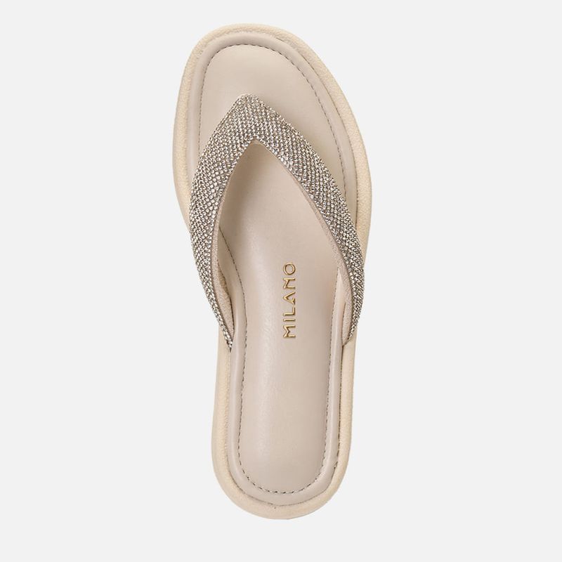 Sandália Papete tipo Chinelo de Dedo com Aplicação de Brilho em Manta de Strass e Palmilha Ultra Macia Conforto na cor Off White. Com solado emborrachado texturizado no mesmo tom do produto deixando parte da vira aparente, palmilha encaixada super macia e acolchoada em napa com detalhe em costura pesponto fazendo o contorno do formato, tira tipo chinelo dividindo os dedos e cruzada nas laterais do peito do pé, essa tira é feita em material aveludado e acolchoado, tipo puffer, com aplicação de manta de strass em toda a tira com pedrarias no mesmo tom do produto. A palmilha tem a marca Milano aplicada em etiqueta 3D na cor dourada.