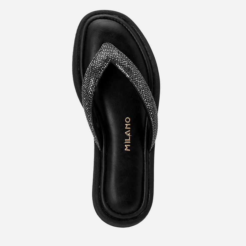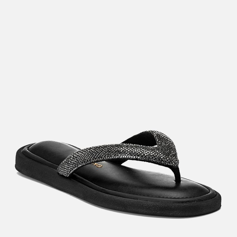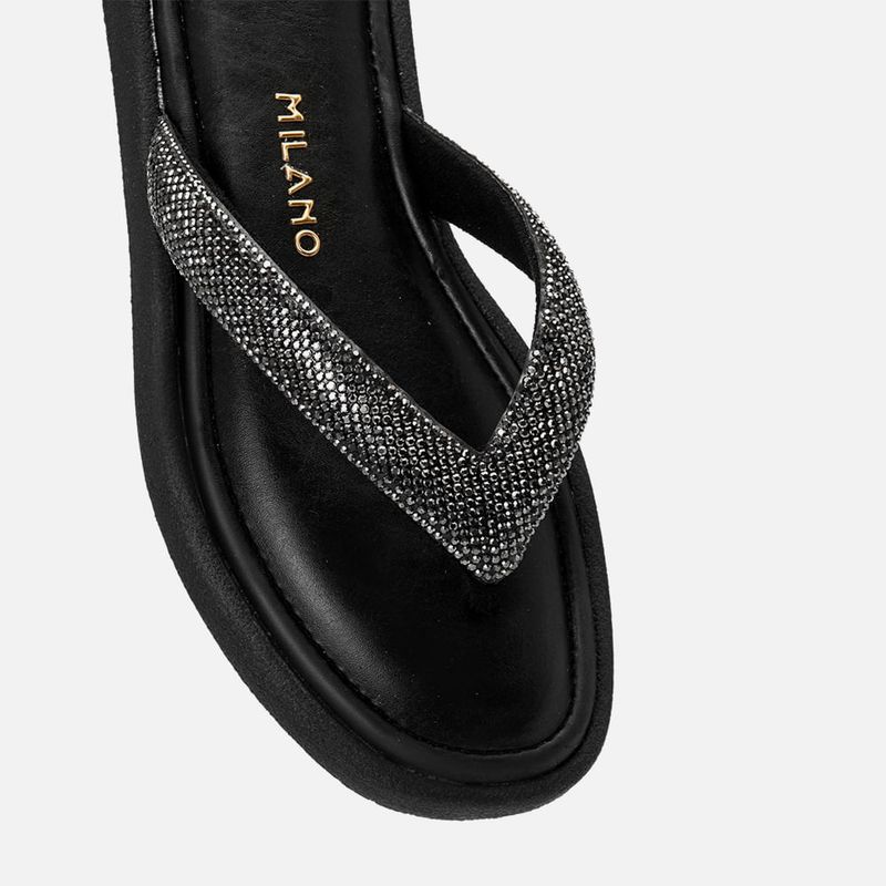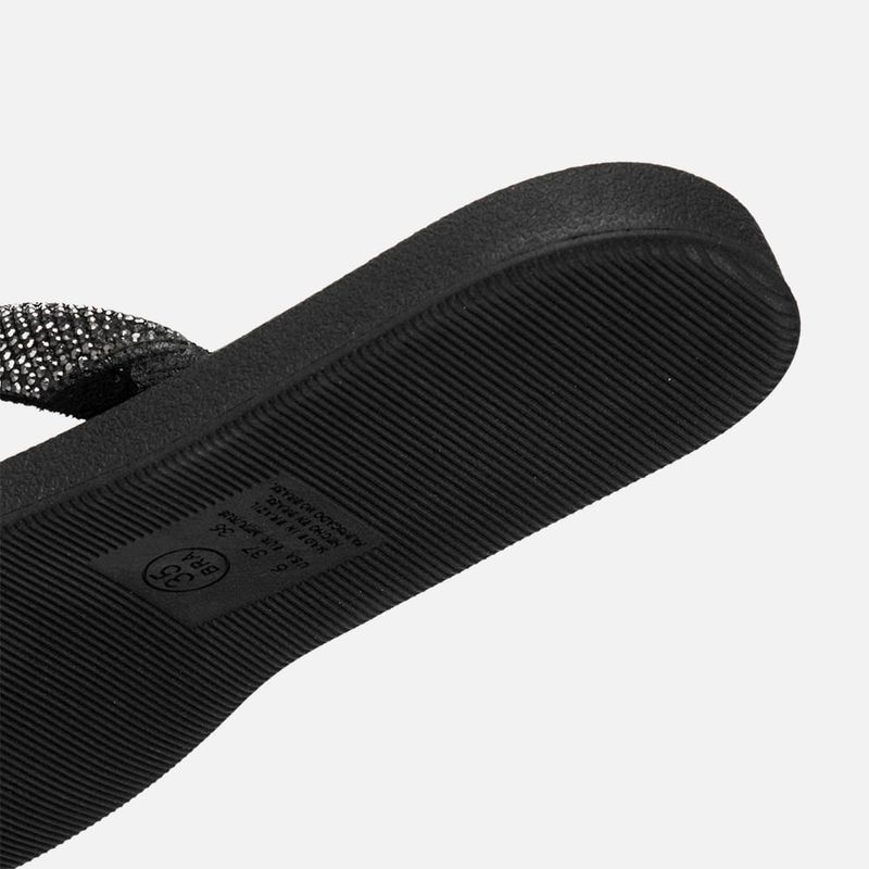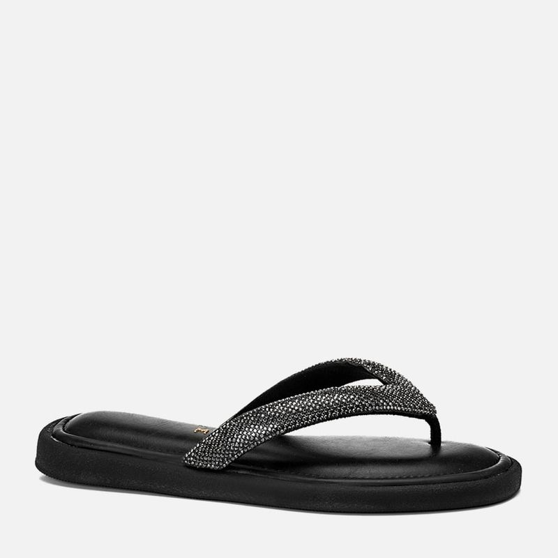 Sandália Papete tipo Chinelo de Dedo com Aplicação de Brilho em Manta de Strass e Palmilha Ultra Macia Conforto na cor Preto. Com solado emborrachado texturizado no mesmo tom do produto deixando parte da vira aparente, palmilha encaixada super macia e acolchoada em napa com detalhe em costura pesponto fazendo o contorno do formato, tira tipo chinelo dividindo os dedos e cruzada nas laterais do peito do pé, essa tira é feita em material aveludado e acolchoado, tipo puffer, com aplicação de manta de strass em toda a tira com pedrarias no mesmo tom do produto. A palmilha tem a marca Milano aplicada em etiqueta 3D na cor dourada.