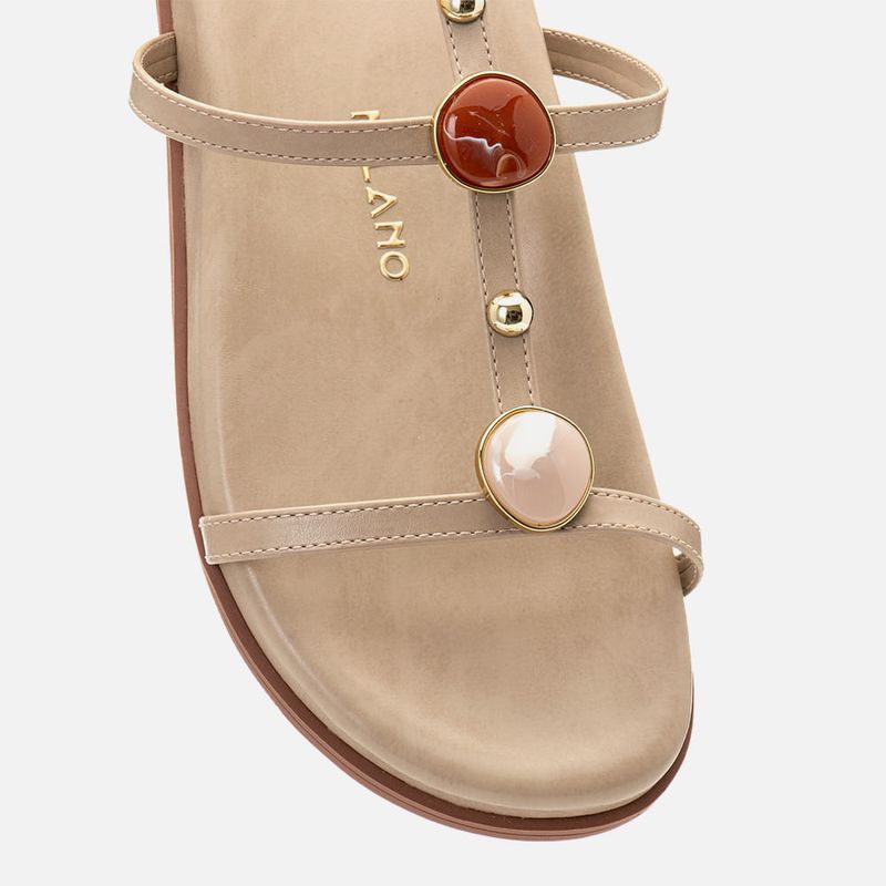 Sandália Papete Fechada com Tiras Cruzadas Detalhe em Mix de Peça Metalizada com Pedraria em Resina e Tachas em Metal com Palmilha Conforto Anatômica na cor Bege. Com solado emborrachado na cor caramelo com altura média e formato oversize com vira aparente, palmilha com formato anatômico para maior conforto com traseira e bico arredondados, as tiras são finas achatadas sendo: uma sobre os dedos e uma na base do tornozelo cruzada por uma tira que atravessa verticalmente o peito do pé, unindo as duas tiras a uma terceira que cruza o tornozelo – a tira central tem detalhe em mix de peça metalizada redonda na cor dourado cromado com pedraria em resina multicolor rajada e metal em meia esfera na cor dourado, a tira do tornozelo faz o fechamento em fivela com ajuste e regulagem do calce. O modelo é aberto na traseira e a palmilha tem a marca Milano aplicada em etiqueta 3D na cor dourada.