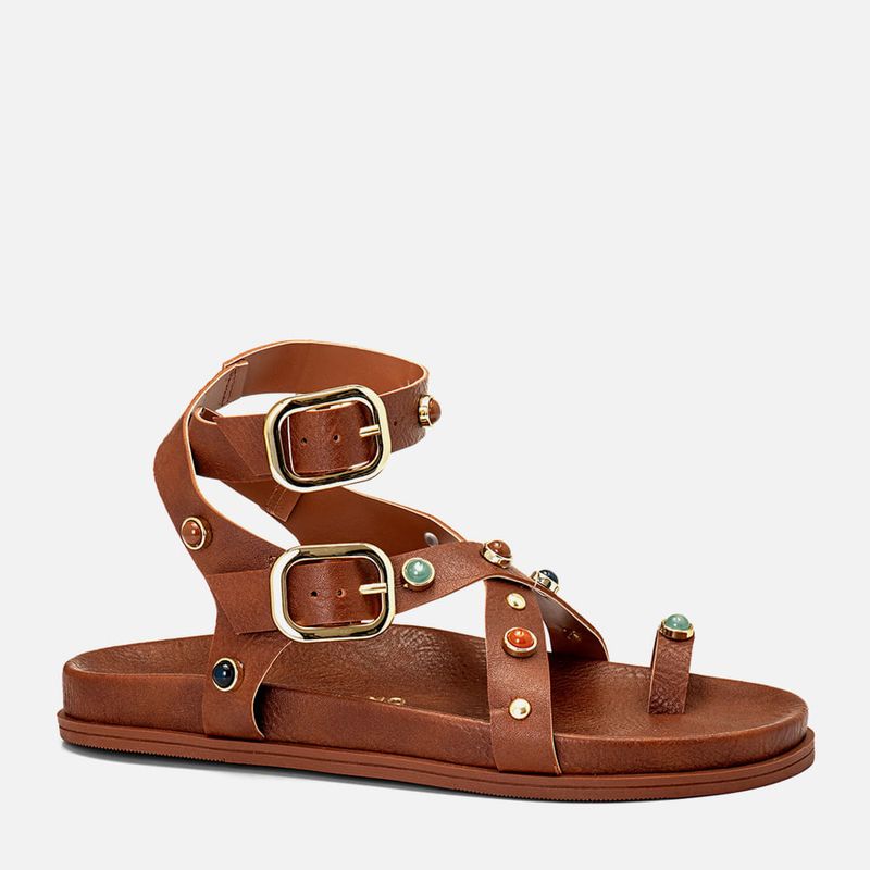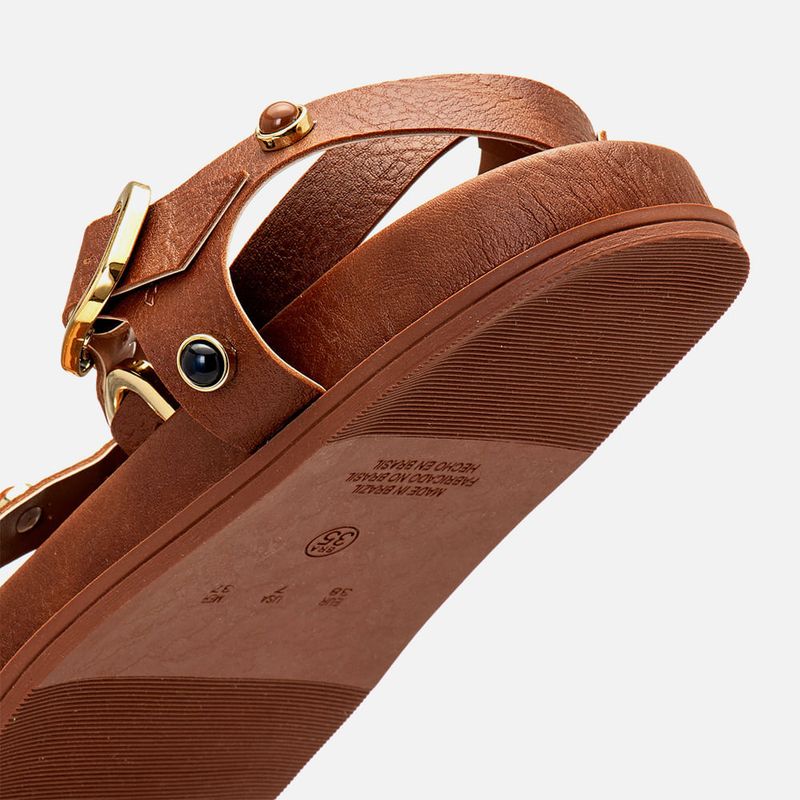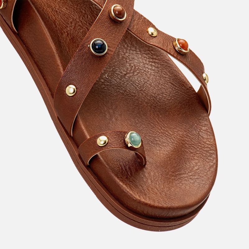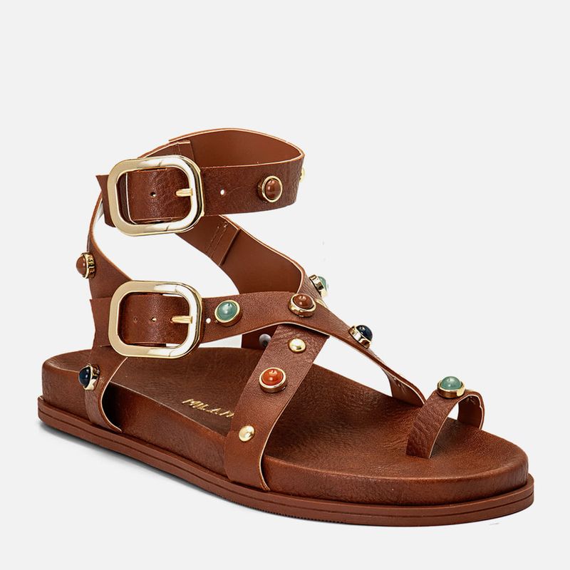 Sandália Papete com Tiras Cruzadas, Ring Toe ou Anel de Deddo, Aplicação de Tachas Estilo Boho em Metal e Pedraria de Resina Multicolor com Palmilha Anatômica na cor Caramelo. Com solado emborrachado achatado na cor caramelo, palmilha revestida em napa texturizada com formato anatômico, tira fina dividindo o dedão tipo ring toe ou anel de dedo ou dedeira e duas tiras médias cruzadas em X sobre o peito do pé, fixadas nas laterais e cruzadas alta no tornozelo, estilo gladiadora, com aplicação de tachas estilo boho feitas em base de metal com pedraria em meia esfera de resina em tons multicoloridos e também rebites, os metais são em tons dourados. A papete tem duas maxi fivelas retangulares que fazer o ajuste e regulagem do calce, sendo uma na tira lateral externa e a outra na tira alta do tornozelo. A palmilha tem a marca Milano aplicada em etiqueta 3D na cor dourada.