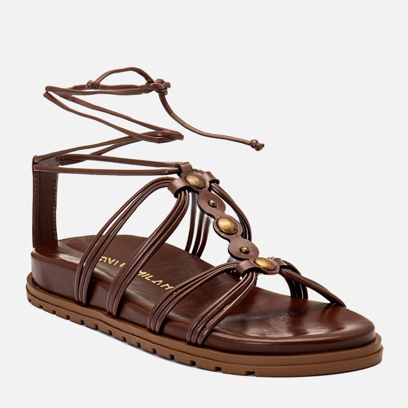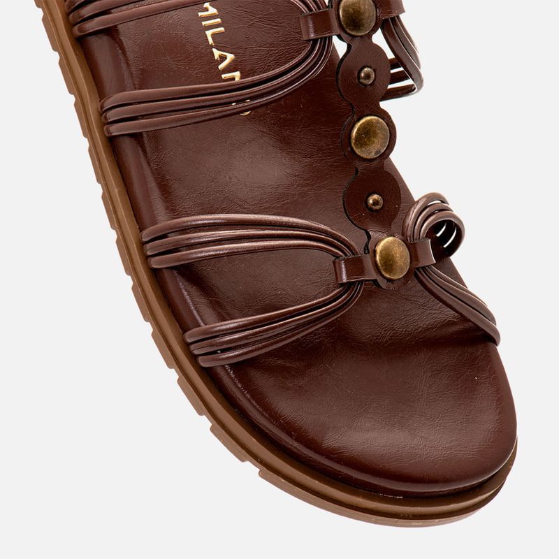 Sandália Papete Tratorara com Tiras Finas e Amarração Estilo Gladiadora e Aplicação de Tachas em Rebite e Medalha de Metal na cor Marrom. Com solado emborrachado na cor caramelo com detalhe levemente tratorado dentado, palmilha encaixada com formato anatômico e revestida em napa lisa, grupo de três tiras arredondadas fininhas nas laterais dos dedos e peito do pé fixando uma tira que sobe pelo pé com recorte à laser acompanhando o formato das aplicações em tachas de metal sendo mini rebites e medalhas médias na cor ouro envelhecido, essa mesma tira tem um passador para a tira longa que faz o fechamento em amarração no tornozelo estilo gladiadora e é sustentada por tira traseira. A palmilha tem a marca Milano aplicada em etiqueta 3D na cor dourada.