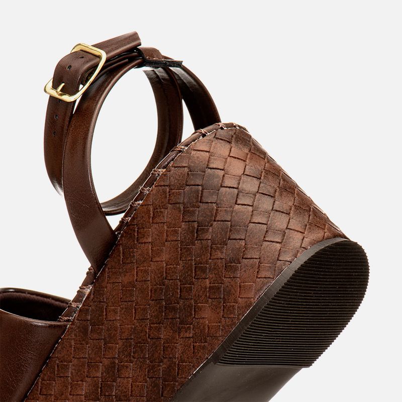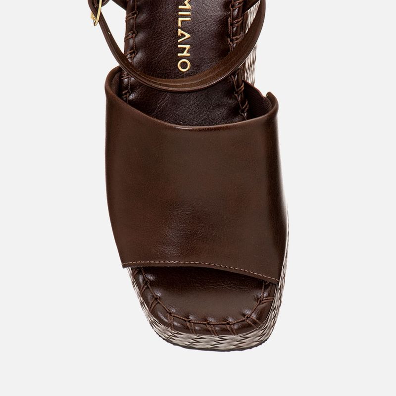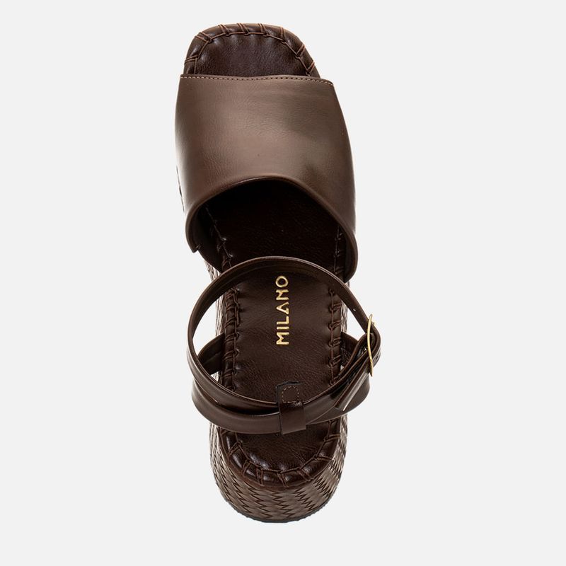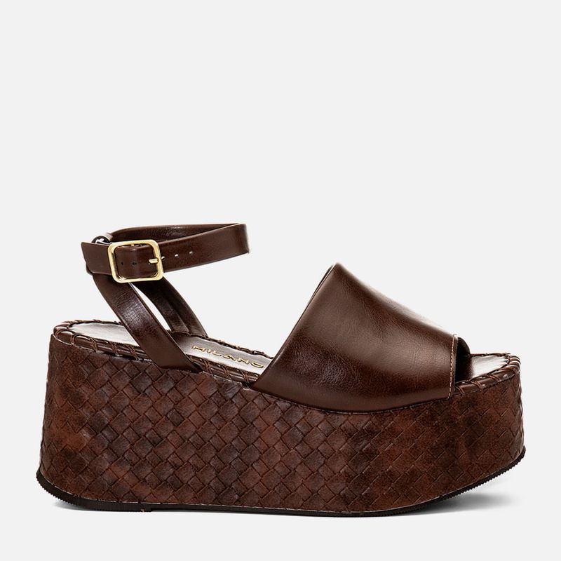 Sandália Plataforma Sola Alta Revestida em Napa tipo Tressê com Tira Larga e Detalhe em Contorno em Ponto de Crochê na cor Café. Com solado emborrachado no mesmo tom do produto, salto tipo plataforma alta revestida em napa com textura tipo tressê, palmilha encaixada com traseira arredondada e bico quadrado, ela é macia e tem detalhe em costura fazendo o contorno da forma em ponto de crochê, a tira é tipo slide larga com os dedos aparentes e duas tiras achatadas médias saindo das laterais e cruzadas no tornozelo com fechamento em fivela em metal dourado. A palmilha tem a marca Milano aplicada em etiqueta 3D na cor dourada.