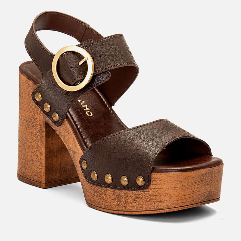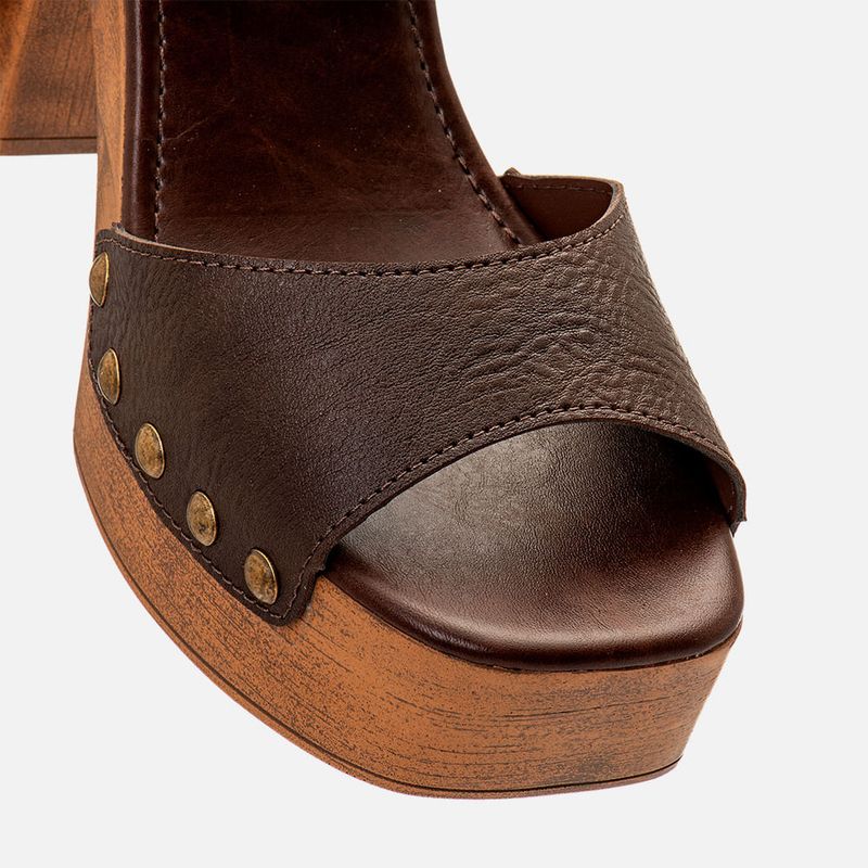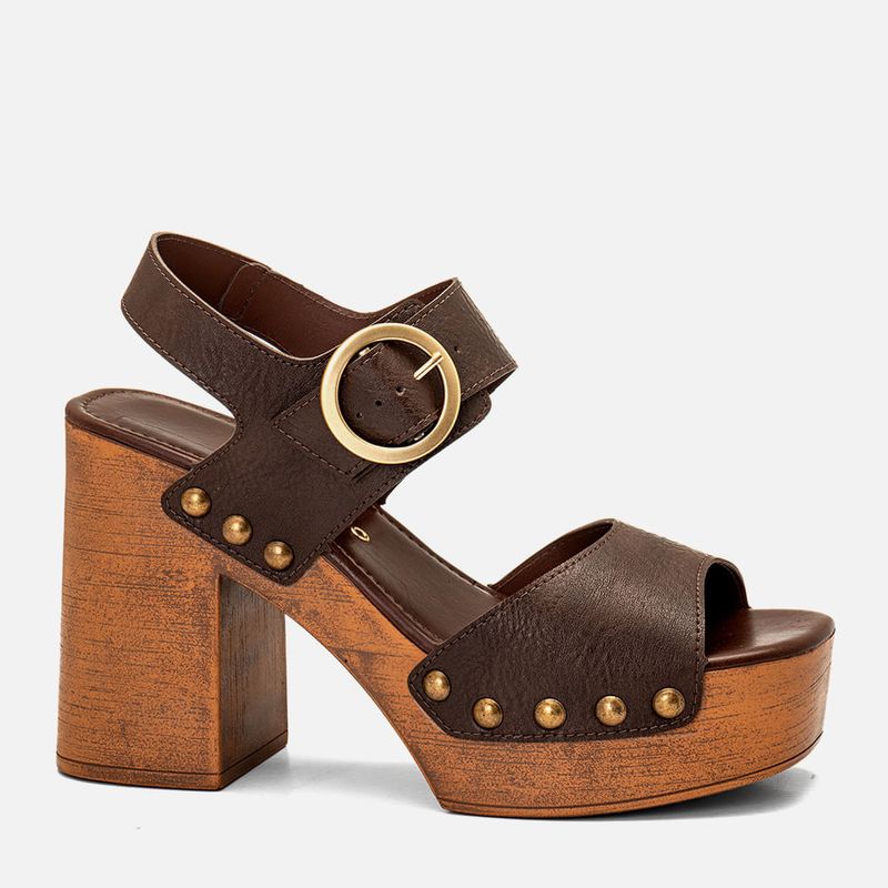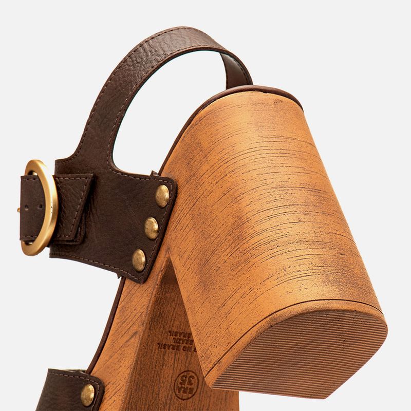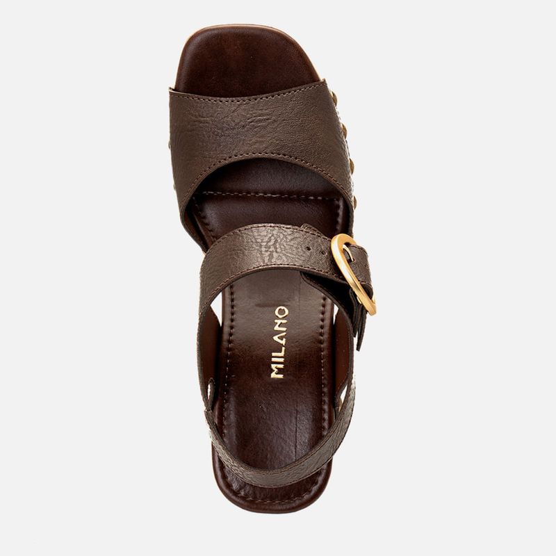Sandália Plataforma Salto Alto Bloco Meia Pata Leve Textura Madeira e Detalhe em Aplicação de Tachas em Metal Ouro Velho na cor Marrom. Com sola em peça única bipartida em salto e meia pata com textura tipo madeira, sendo o salto alto bloco grosso, feita em material super leve apesar da aparência pesada, palmilha macia com traseira arredondada e bico quadrado revestida em napa lisa, cabedal feito em tiras largas tipo slide sobre os dedos com decote arredondado e tira larga saindo das laterais do tornozelo e cruzada no calcanhar fazendo o fechamento por maxi fivela redonda na cor dourada permitindo o ajuste e regulagem do calce, mas laterais onde as tiras se unem à palmilha possui um acabamento em tira com aplicação de tachas em metal na cor dourado. A palmilha tem ainda a marca Milano aplicada em etiqueta 3D na cor dourada.
