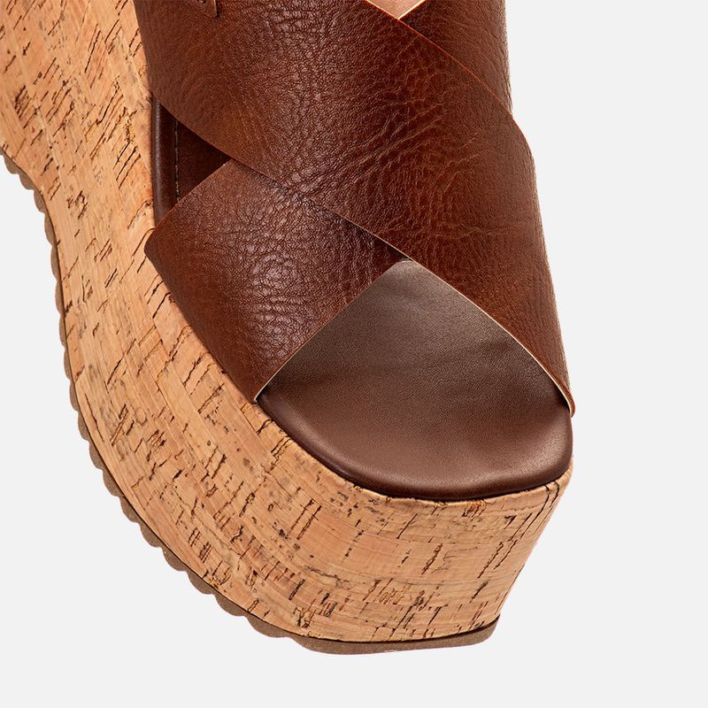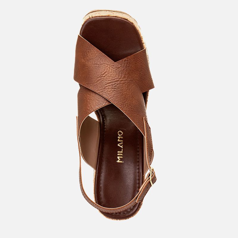 Sandália Plataforma Salto Anabela Revestido em Textura Cortiça Natural e Tiras em X na cor Marrom. Com solado emborrachado na cor caramelo levemente tratorado, sola plataforma alta anabelada feita em peça única com formato ondulado na base totalmente revestida em cortiça natural, a palmilha é revestida em napa com traseira arredondada e bico quadrado com cantos arredondados, tiras largas cruzadas em X abraçando o pé e fechamento por tira fixada nesta e cruzada no calcanhar com ajuste e regulagem do calce por fivela em metal dourado. A palmilha é macia e tem a marca Milano aplicada em etiqueta 3D na cor dourada.