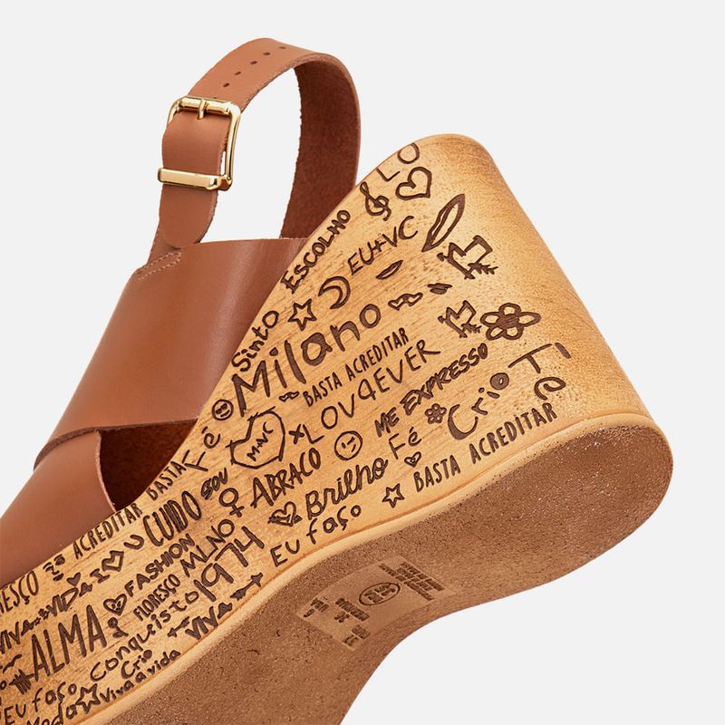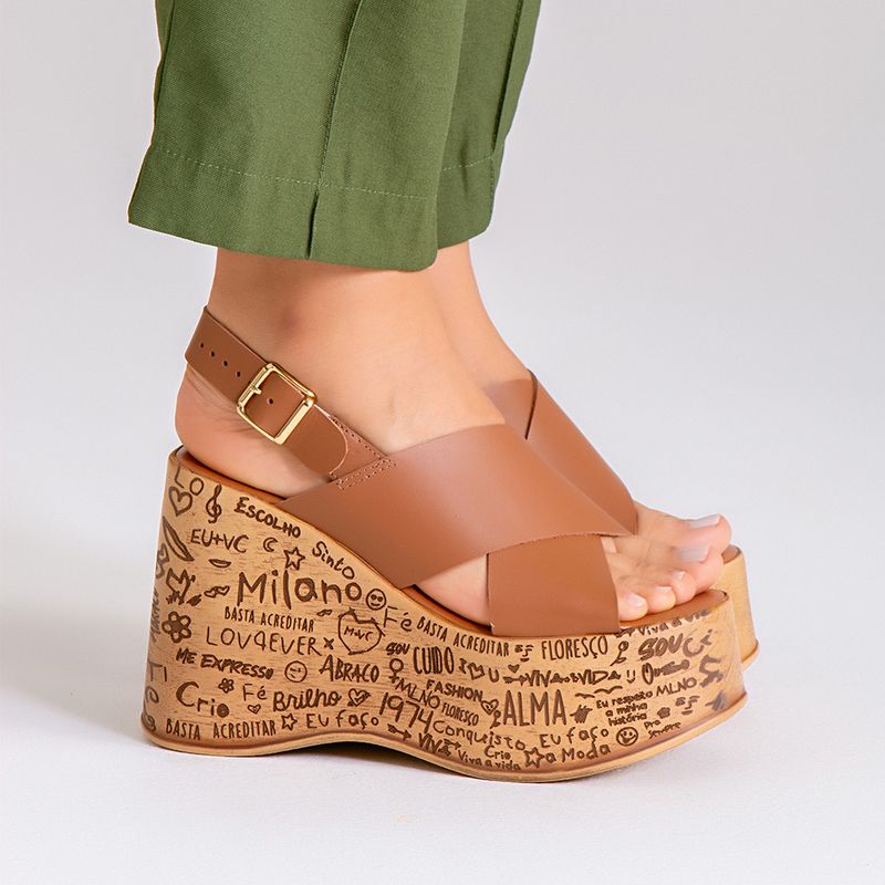 Sandália Plataforma Salto Anabela Feita em Couro Estampado à Laser com Grafismo Ilustração Exclusivo e Tiras em X na cor Caramelo. Com sola plataforma alta em peça única formato ondulado, lateral externa estilizada com estampa feita à laser com grafismos/ilustrações EXCLUSIVA Milano, inspirada nas tendências internacionais – a composição inclui desenhos, frases e palavras inspiracionais e divertidas, esta personalização não se aplica nas faces frontal e traseira e nem na interna, a palmilha é revestida em napa com traseira arredondada e bico quadrado com cantos arredondados, tiras largas feito em couro legítimo cruzadas em X abraçando o pé e fechamento por tira fixada nesta e cruzada no calcanhar com ajuste e regulagem do calce por fivela em metal dourado. A palmilha é macia e tem a marca Milano aplicada em etiqueta 3D na cor dourada.