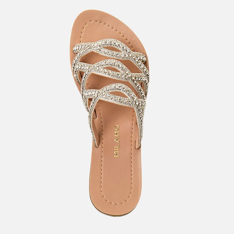 Sandália Rasteira Aberta com Aplicação de Brilho em Mix de Pedrarias com Recorte à Laser Estilo Boho e Palmilha Laqueada Bicolor na cor Cristal. Com solado laqueado em tom nude com saltinho mínimo incorporado no formato, palmilha fundida na sola bicolor com traseira e bico arredondados com aplique em napa no tom nude com detalhe em costura pesponto em sobretom fazendo o contorno do modelo. Tira que cobre todo o peito do pé, feita em peça única com recorte à laser com formato cruzado orgânico no estilo boho com aplicação total em mix de pedrarias sendo cristais em dois tons e em tamanho grande na parte central e pequeno fazendo o contorno da peça. O modelo é aberto de calce prático apenas de enfiar o pé sem amarrações. Possui a marca Milano aplicada na palmilha em etiqueta 3D na cor dourada.