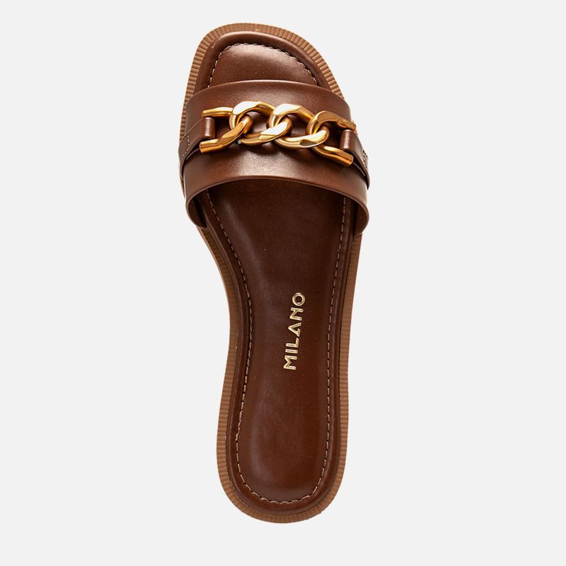 Sandália Rasteira Aberta Estilo Boho com Tira Slide e Detalhe em Maxi Corrente Dourada na cor Marrom. Com solado emborrachado na cor caramelo com saltinho mínimo e vira com detalhe em textura 3D, palmilha ultra macia acolchoada com detalhe em costura pesponto seguindo o contorno encaixada com traseira e bico arredondados, tira larga tipo slide feito em peça única com detalhe em tira central mais fina com maxi corrente no peito do pé, na cor dourada fosca, o modelo é aberto de calce prático. A palmilha tem aplicação da marca Milano em etiqueta 3D na cor dourada.