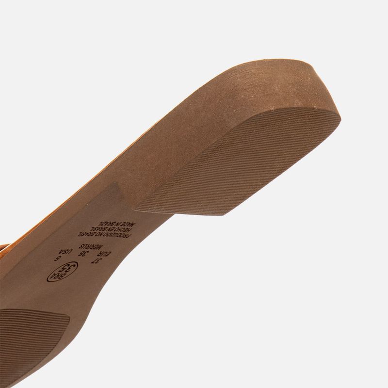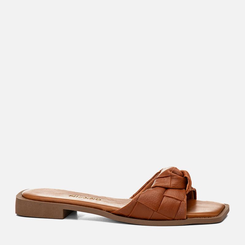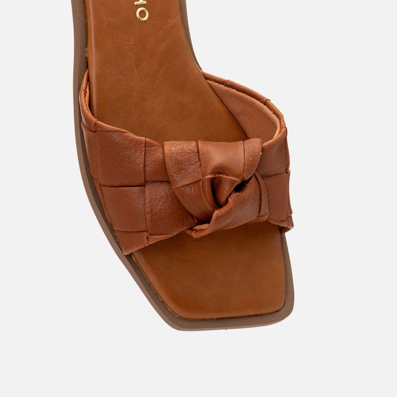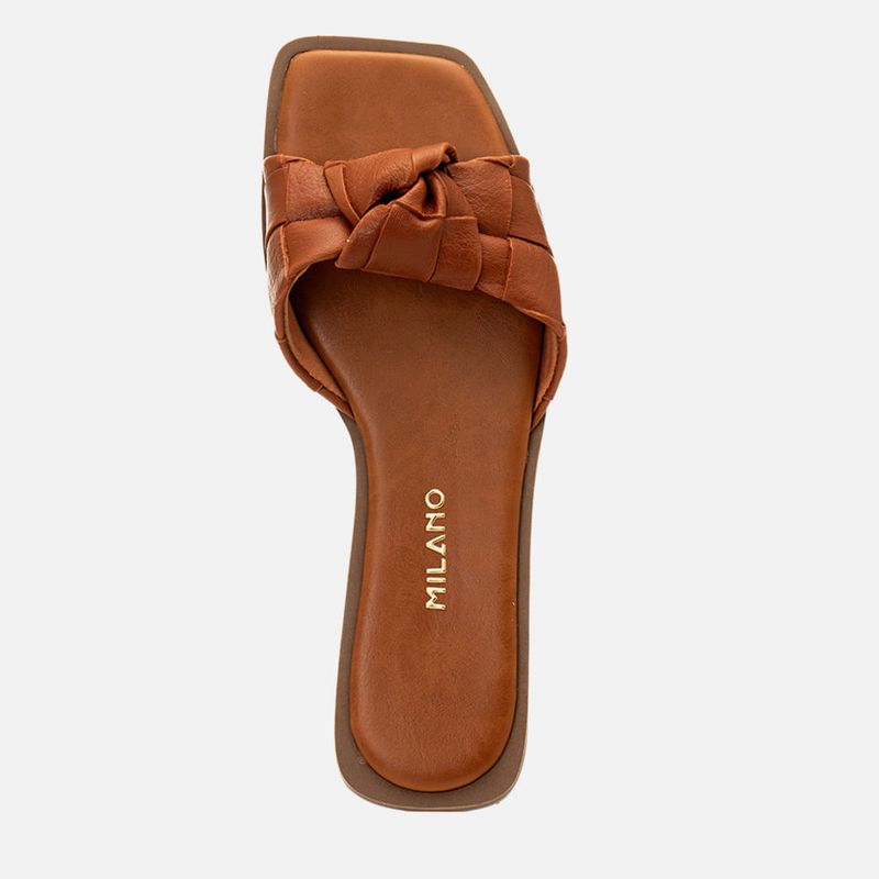 Sandália Rasteira Aberta com Salto Baixo e Tira em Tramado Tressê e Nozinho na cor Caramelo. Com solado emborrachado caramelo com salto baixo e vira aparente, palmilha encaixada super macia com traseira arredondada e bico quadrado, tira slide com decote redondo no peito do pé feita em tramado da napa tipo tressê em padrão xadrez com detalhe em nozinho sobre os dedos. O modelo é aberto de calce prático e tem a marca Milano aplicada em etiqueta 3D na cor dourada.
