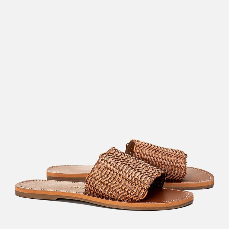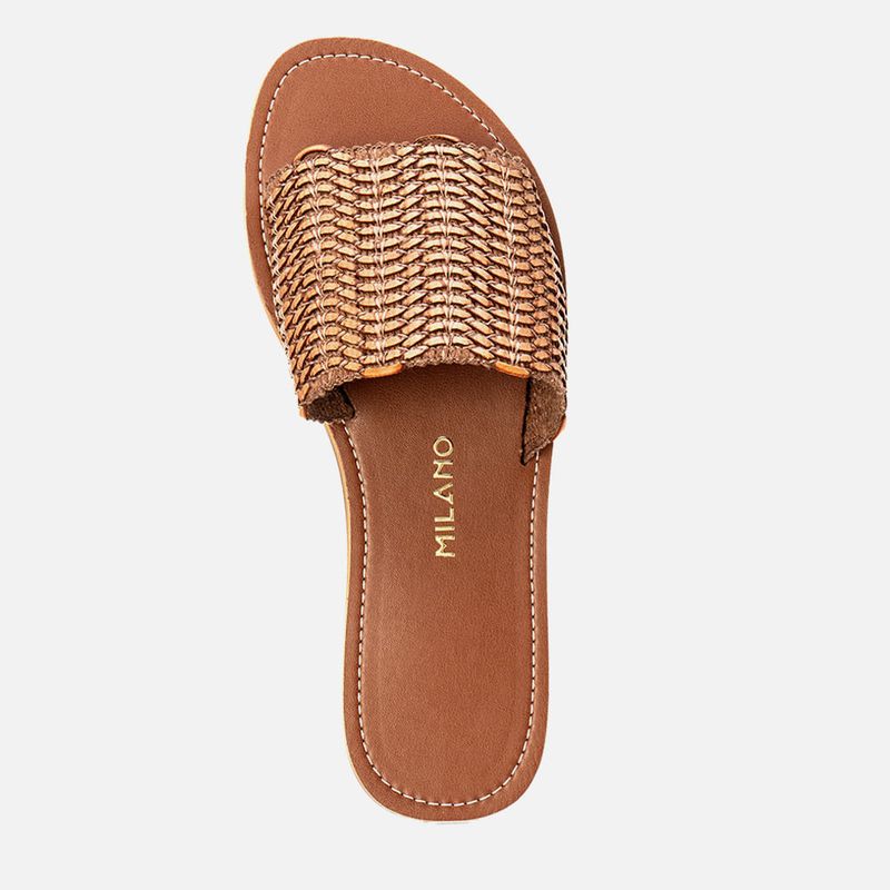 Sandália Rasteira Aberta tipo Slide em Tira Tramada Natural Estilo Boho e Palmilha Flat na cor Caramelo. Com solado emborrachado na cor caramelo com saltinho mínimo, palmilha flat sobreposta com traseira e bico arredondados, revestida em napa na cor caramelo e detalhe em costura pesponto fazendo o contorno da forma, tira larga em peça única tipo slide feita em material tramado com padrão em ondas e costuras, o modelo é aberto de calce prático. A palmilha tem a marca Milano aplicada em etiqueta 3D na cor dourada.