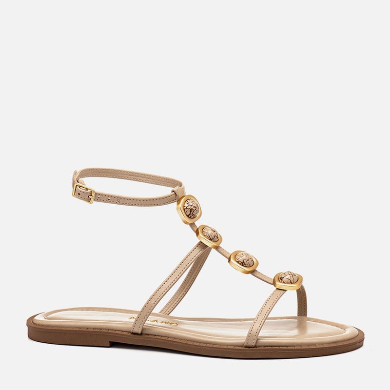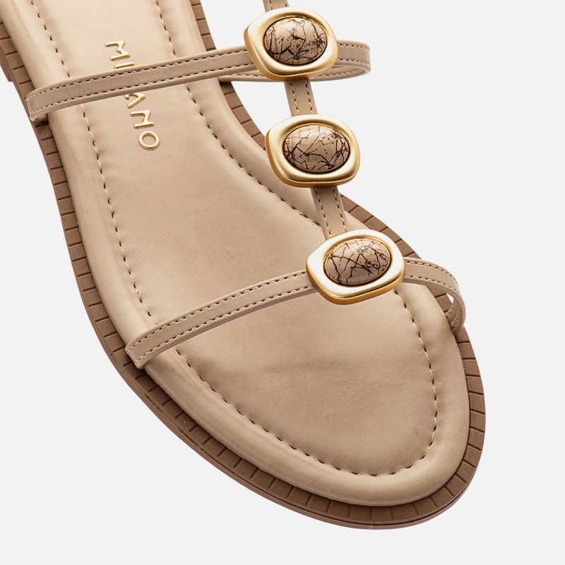 Sandália Rasteira Fechada com tiras Finas e Aplicação em Peça Metalizada com Formato Orgânico e Pedraria em Resina na cor Bege. Com solado emborrachado na cor caramelo com saltinho mínimo e vira com detalhe em textura 3D, palmilha ultra macia acolchoada com detalhe em costura pesponto seguindo o contorno encaixada com traseira e bico arredondados, tiras finas achatadas sobre os dedos e peito do pé, unidas por uma tira central que atravessa verticalmente o peito do com passador para a tira que cruza o tornozelo fazendo o fechamento, nessa tira central são aplicadas 4 peças metalizadas com formato orgânico na cor dourado fosco com pedraria rajada em resina no mesmo tom do produto no centro da peça, o fechamento tem ajuste e regulagem do calce por fivela. A palmilha tem a marca Milano aplicada em etiqueta 3D na cor dourada.