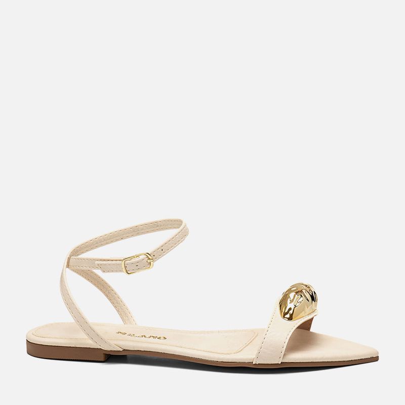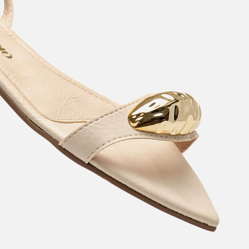 Sandália Rasteira com Bico Folha Aplicação de Peça Orgânica Dourada e Tiras Fininhas na cor Off White. Com solado rasteiro e saltinho mínimo, palmilha com traseira arredondada e bico folha, tira sobre os dedos com recorte arredondado e aplicação de peça metalizada em formato orgânico metalizada na cor dourada, duas tiras fininhas achatadas saindo das laterais tornozelo cruzadas no calcanhar fazendo o fechamento e regulagem do calce por fivela. A palmilha tem aplique no mesmo material colada e a marca Milano aplicada em etiqueta 3D na cor dourada.