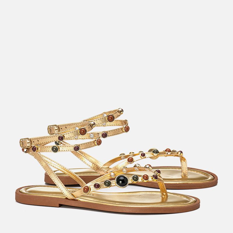 Sandália Rasteira Metalizada com Tiras Finas e Aplicação de Brilho em Metal ou Tachas Estilo Boho com Pedrarias em Resina Multicolor na cor Ouro. Com solado emborrachado na cor caramelo com saltinho mínimo e vira com detalhe em textura 3D, palmilha ultra macia acolchoada encaixada com traseira e bico arredondados e detalhe em costura pesponto fazendo o contorno da forma, tira fina achatada dividindo os dedos e cruzada em diagonal no peito do pé até a lateral do tornozelo de onde sai uma tira fina que se cruza no calcanhar e faz duas voltas no tornozelo estilo amarração, ambas as tiras tem aplicação em metal tipo tachas, ou studs, estilo boho sendo metal arredondado na cor dourada em 2 tamanhos com pedraria em resina em tons multicolor verde musgo, caramelo, marsala e preto. O fechamento é feito por fivela com ajuste e regulagem do calce. A palmilha tem a marca Milano aplicada em etiqueta 3D na cor dourada.