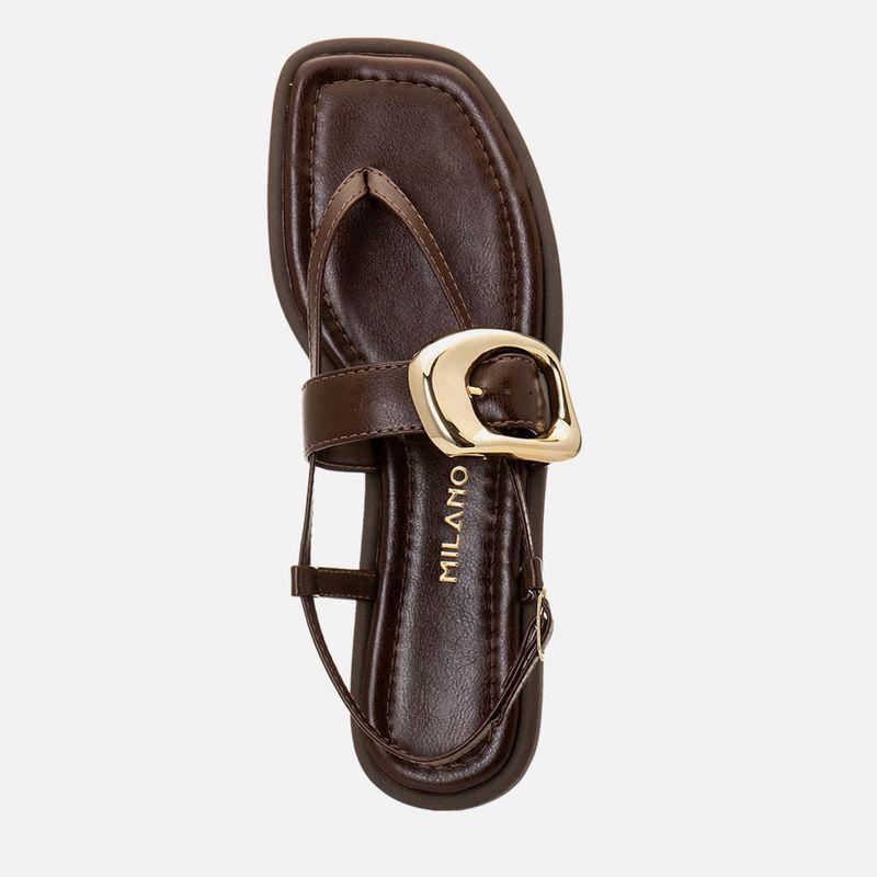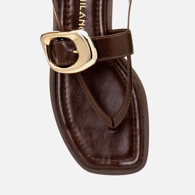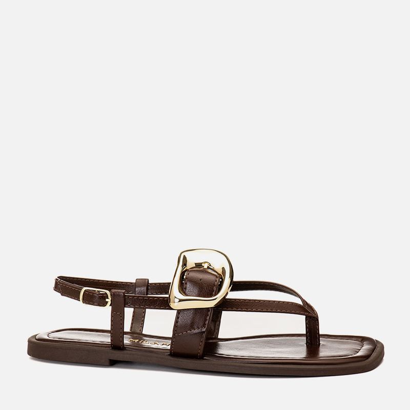 Sandália Rasteira com Tiras Finas Dividindo os Dedos e Cruzadas e Detalhe em Maxi Fivela Orgânica Dourada na cor Café. Com solado emborrachado no mesmo tom do produto, com saltinho mínimo e bordas aparentes tipo vira, palmilha ultra macia revestida em napa, acolchoada e encaixada com traseira arredondada, bico quadrado e detalhe em costura pesponto fazendo o contorno da forma, tiras finas achatadas dividindo os dedos, tipo chinelo, e cruzadas sob o peito do pé até a traseira do tornozelo fazendo o fechamento em fivela – que permite o ajuste e regulagem do calce, possui ainda uma tira larga sob a base do tornozelo com detalhe em maxi fivela com formato orgânico na cor dourado cromado e outra duas tiras achatadas finas que fazem a sustentação da parte traseira. A palmilha tem a marca Milano aplicada em etiqueta 3D na cor dourada.
