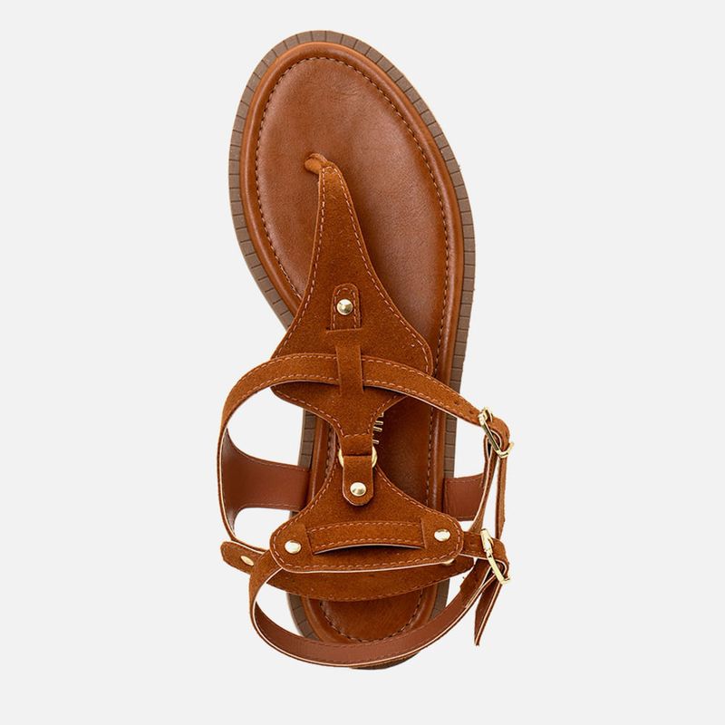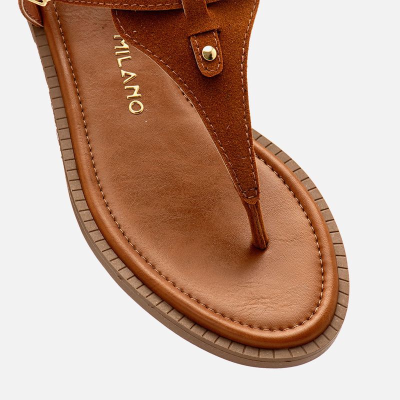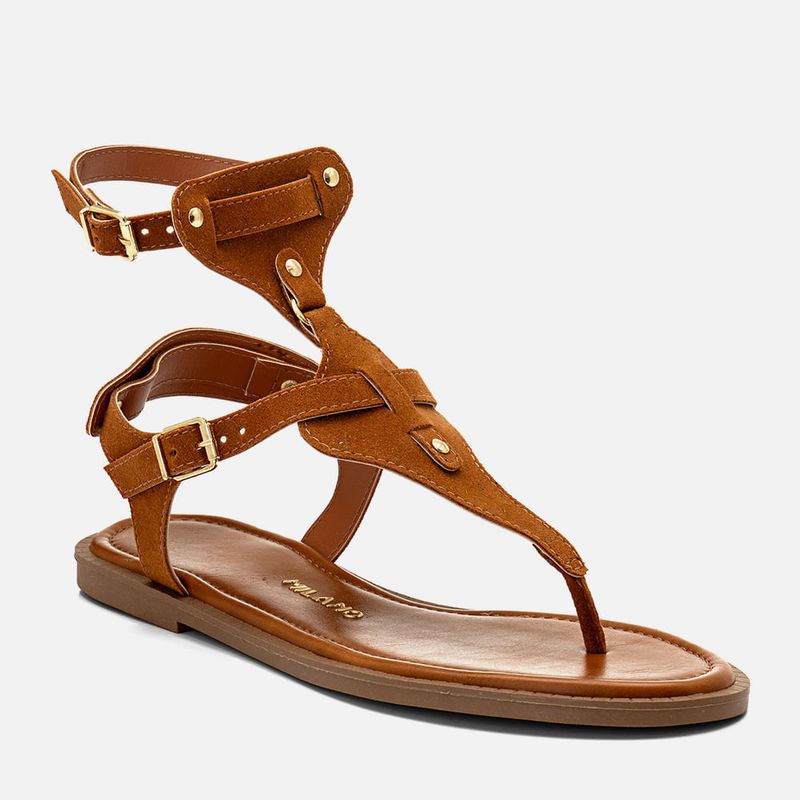 Sandália Rasteira de Dedo Fechada Estilo Gladiadora tipo Camurça na cor Caramelo. Com solado emborrachado no mesmo tom do produto com saltinho mínimo e vira oversize aparente com textura 3D, palmilha macia encaixada e revestida em napa lisa com traseira e bico arredondados com detalhe em costura pesponto fazendo o contorno da forma, tiras feitas em napa tipo camurça com textura aveludada sendo: uma dividindo os dedos com tira larga subindo pelo peito do pé com recortes sendo transpassada por duas tiras, uma que sai da lateral do tornozelo, cruza na traseira do calcanhar e outra na canela, as tiras tem aplicação de tachas em metal dourado e ambas tem fechamento por fivela, permitindo assim o ajuste e regulagem do calce. A palmilha tem a marca Milano aplicada em etiqueta 3D na cor dourada.