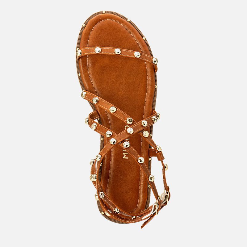 Sandália Rasteira em Estilo Boho com Tiras Finas Cruzadas e Aplicação em Brilho Mix de Pedrarias em Cristal Metalizado Dourado com Ponto de Strass na cor Caramelo. Com solado emborracho com salto mínimo, detalhe em vira texturizada com rebites, palmilha macia com contorno interno em costura pesponto aparente, traseira e bico arredondados, grupo de tiras finas achatadas cruzadas pelo pé sendo: uma sobre os dedos uma saindo da lateral do peito do pé e cruzada em X na parte frontal do tornozelo e uma última saindo da lateral interna do peito do pé e cruzada no calcanhar sustentada por uma tira menor – todas as tiras tem aplicação em estilo boho feita de peças metalizadas estilo cristal na cor dourado cromado com detalher em ponto de strass na parte central da peça, as tiras cruzadas no calcanhar e tornozelo tem fechamento com ajuste e regulagem do calce por fivelas em metal dourada. A palmilha tem a marca Milano aplicada em etiqueta 3D na cor dourada.