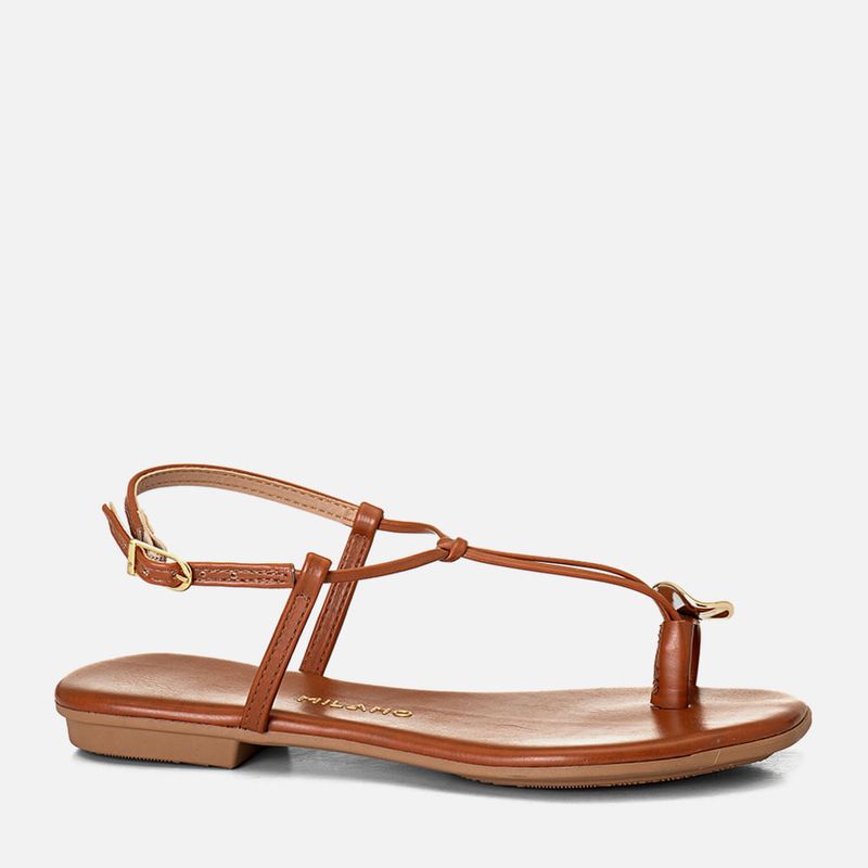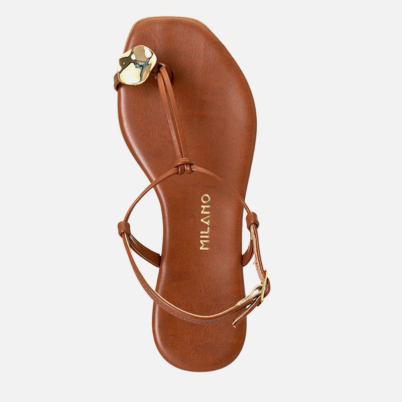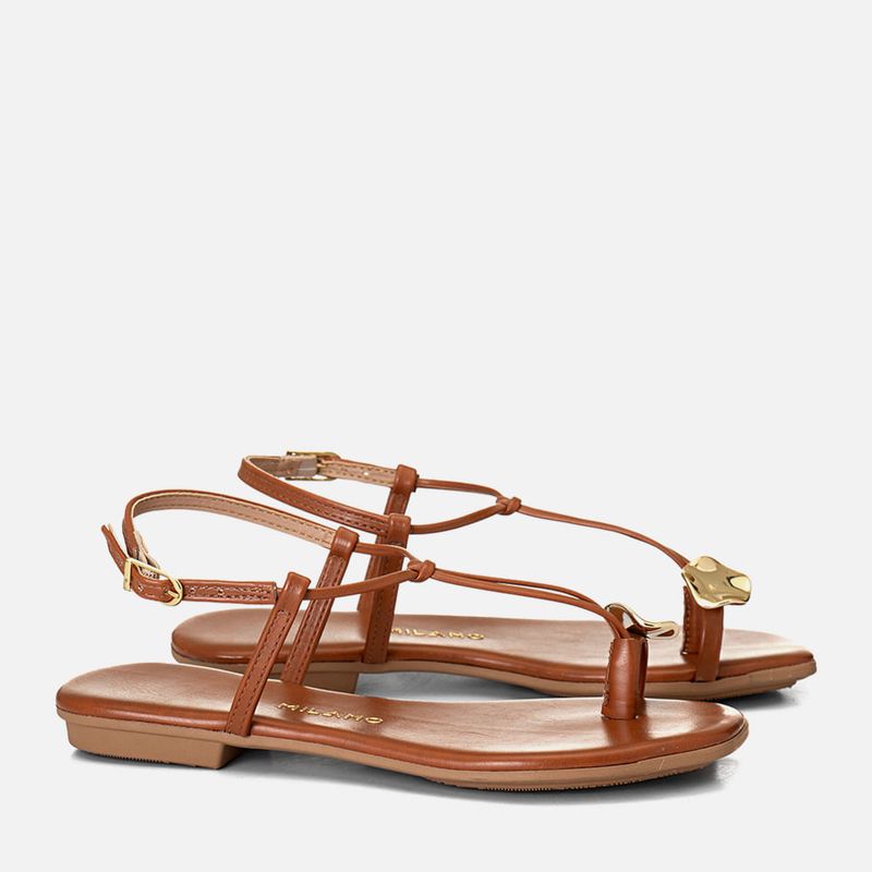 Sandália Rasteira Fechada com Ring Toe Anel de Dedo com Detalhe em Peça Orgânica Metalizada Dourada e Tiras Finas Cruzadas na cor Caramelo. Com solado emborrachado na cor carmelo com saltinho mínimo, palmilha revestida em napa com traseira quadrada com cantos arredondados e bico arredondado, tira tipo ring toe, ou anel de dedo ou dedeira, dividindo o dedão com detalhe em aplicação de peça com formato orgânico metalizado cromado na cor dourada, proteção para o meio dos dedos no mesmo material do produto, tiras ultra finas saindo dessa tira e cruzadas no peito do pé com detalhe em nozinho na base do tornozelo e cruzadas no calcanhar com sustentação em duas tiras achatadas nas laterias, essa tira tem fivela para fechamento e ajuste de regulagem do calce. A palmilha tem a marca Milano aplicada em etiqueta 3D na cor dourada.