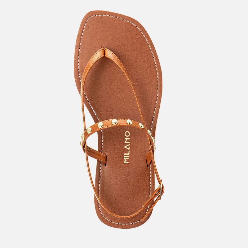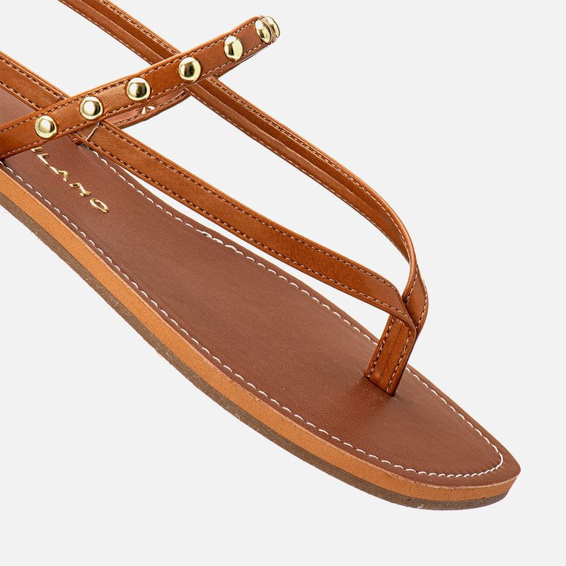 Sandália Rasteira Fechada de Dedo tipo Chinelo com Tiras Finas Achatadas Cruzadas com Aplicação de Metais Tachas tipo Rebites na cor Caramelo. Com solado emborrachado na cor caramelo com saltinho mínimo, palmilha flat sobreposta com traseira e bico quadrados, revestida em napa na cor caramelo e detalhe em costura pesponto fazendo o contorno da forma, tira fina achatada dividindo os dedos tipo chinelo cruzada em diagonal no peito do pé e cruzada no calcanhar, esta possui fivela para fechamento e ajuste de regulagem do calce, possui ainda uma tira cruzada na base do tornozelo com aplicação de brilho em metais, ou tachas, tipo rebite em metal dourado. A palmilha tem a marca Milano aplicada em etiqueta 3D na cor dourada.