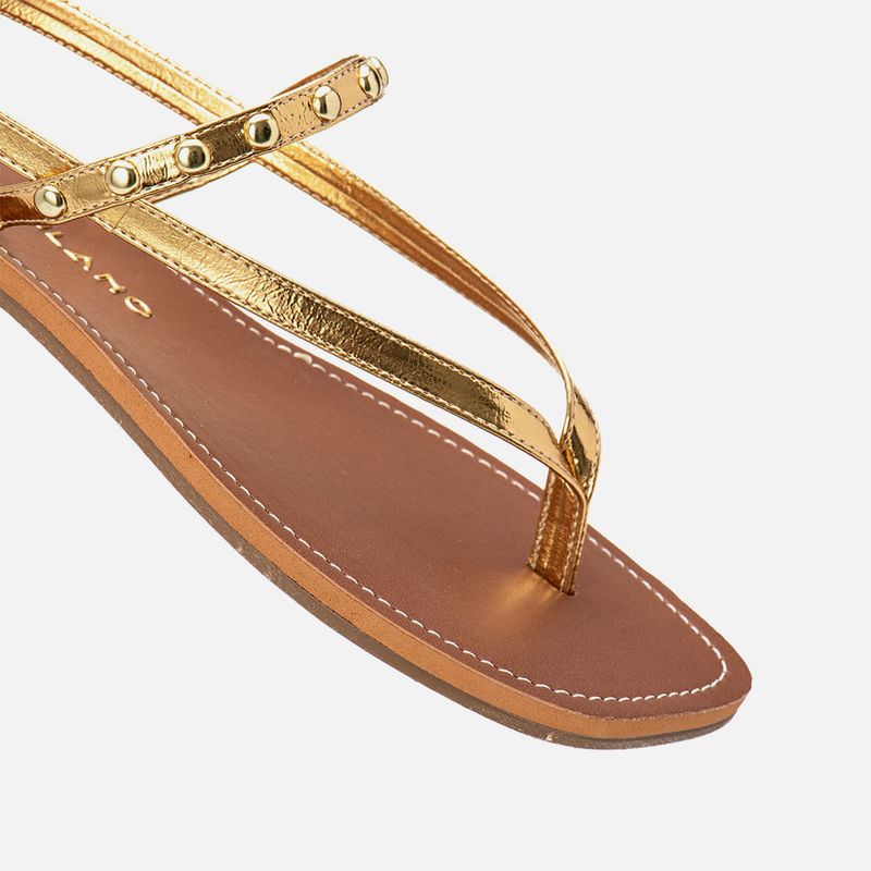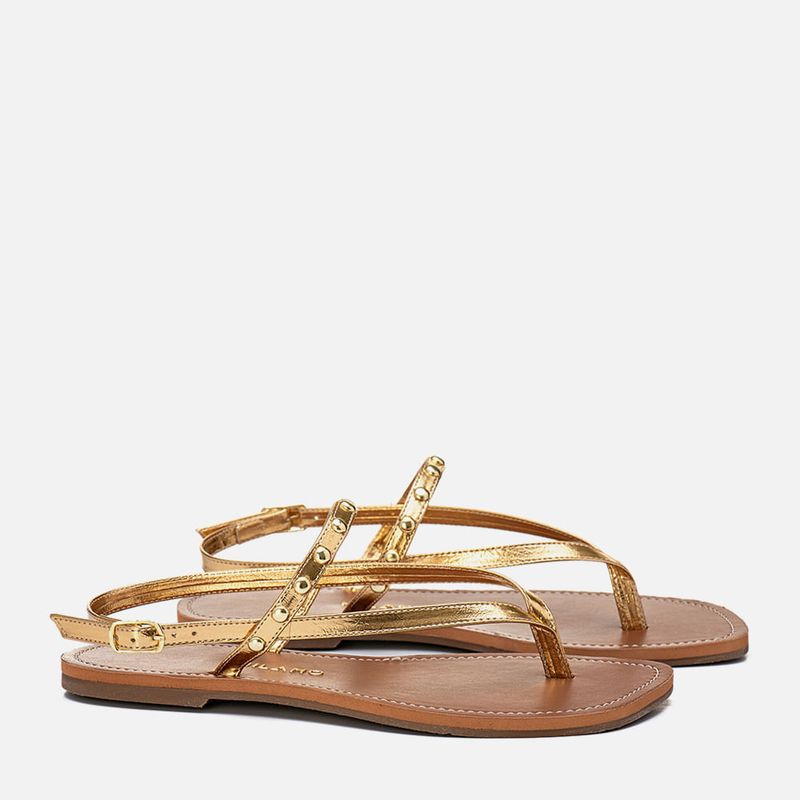 Sandália Rasteira Fechada Metalizada de Dedo tipo Chinelo com Tiras Finas Achatadas Cruzadas com Aplicação de Metais Tachas tipo Rebites na cor Ouro. Com solado emborrachado na cor caramelo com saltinho mínimo, palmilha flat sobreposta com traseira e bico quadrados, revestida em napa na cor caramelo e detalhe em costura pesponto fazendo o contorno da forma, tira fina achatada dividindo os dedos tipo chinelo cruzada em diagonal no peito do pé e cruzada no calcanhar, esta possui fivela para fechamento e ajuste de regulagem do calce, possui ainda uma tira cruzada na base do tornozelo com aplicação de brilho em metais, ou tachas, tipo rebite em metal dourado. A palmilha tem a marca Milano aplicada em etiqueta 3D na cor dourada.