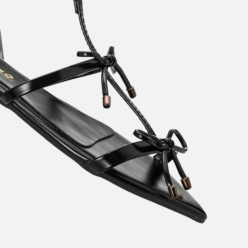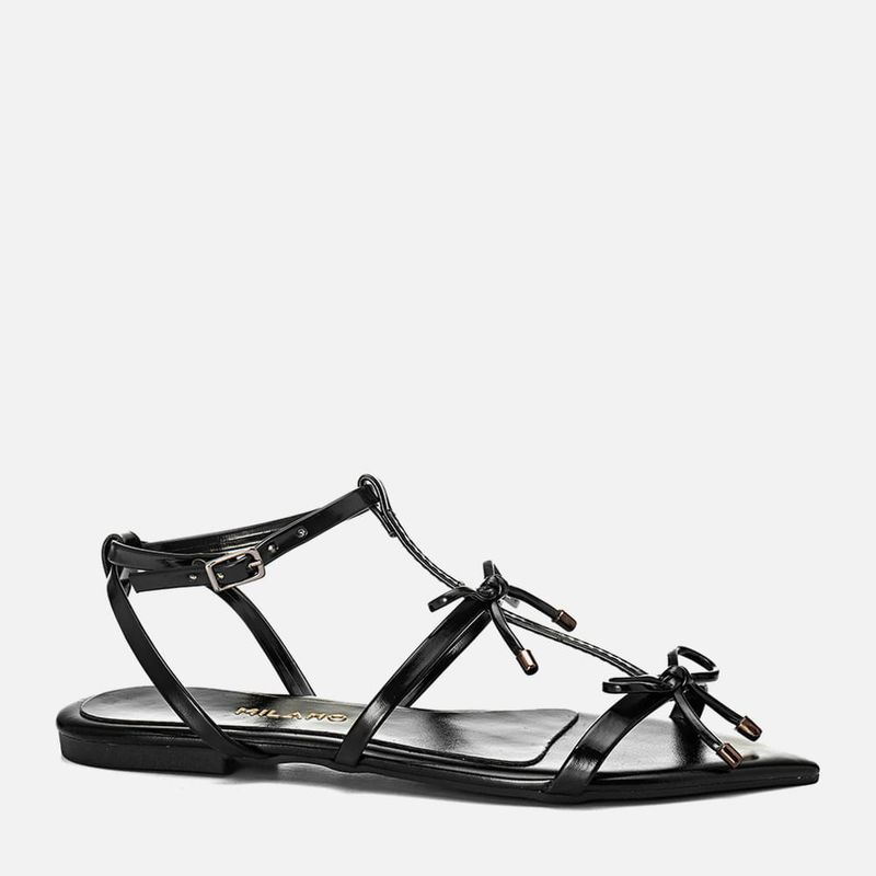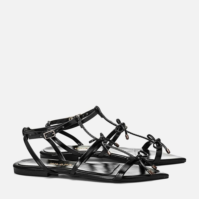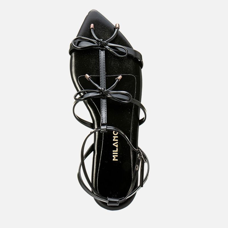Sandália Rasteira Fechada Estilo Boho com Bico Fino tipo Folha e Tiras Cruzadas e Detalhe em Lacinhos na cor Preto. Com solado emborrachado no mesmo tom do produto com saltinho mínimo, palmilha macia com traseira arredondada e bico fino tipo folha, tiras finas achatadas cruzadas sobre os dedos e peito do pé unidas centralmente por tira conectada a tira do tornozelo – que sai das laterais do tornozelo e cruzam em X no calcanhar, que possui fivela para fechamento e ajuste de regulagem do calce, as duas tiras no pé possuem detalhe em aplicação de lacinho com ponteiras em metal na cor ouro velho. A palmilha tem a marca Milano aplicada em etiqueta 3D na cor dourada.