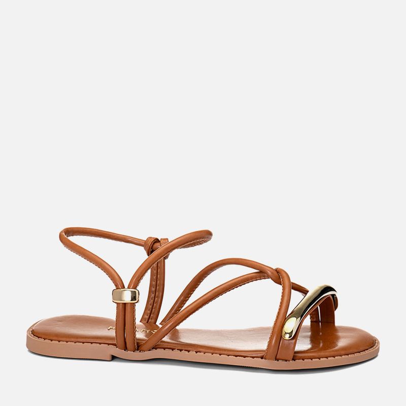 Sandália Rasteira Fechada com Tiras Cruzadas Peça Metalizada com Formato Orgânico e Calce Prático com Palmilha Ultra Macia Conforto na cor Caramelo. Com solado emborrachado texturizado no mesmo tom do produto deixando parte da vira aparente, palmilha encaixada super macia e acolchoada em napa, tira achatada sobre os dedos com aplicação de peça metalizada com formato orgânico na cor dourado cromado, tiras arredondadas estruturadas cruzadas em X no peito do pé, outra tira dupla sai da lateral externa do pé e cruza no tornozelo fazendo o fechamento por calce prático – através de peça metalizada deslizável, esta tira é sustentada na parte interna por outra tira. A palmilha tem a marca Milano aplicada em etiqueta 3D na cor dourada.