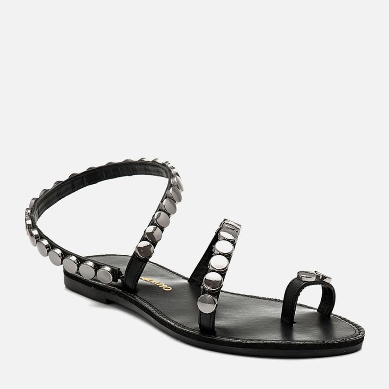 Sandália Rasteira Fechada com Tiras Finas e Aplicação de Brilho em Tira de Tachas Metalizada na cor Preto. Com solado rasteiro com salto mínimo, composto de sola laqueada + palmilha emborrachada, aplique na parte superior em napa na cor caramelo com detalhe em contorno do formato em costura pesponto em sobretom ao produto, tiras finas achatadas sendo uma dividindo o dedão tipo ring toe – ou anel de dedo ou dedeira, uma saindo da lateral externa dos dedos e cruzada em diagonal no peito do pé e uma última saindo e fechamento na lateral do tornozelo para calce prático sem amarração – apenas encaixando o pé, o ajuste é feito por elástico no mesmo tom do produto, todas as tiras tem aplicação em tira de tachas tipo medalha pequenas lisas na cor chumbo metalizado. A palmilha tem a marca Milano aplicada em etiqueta 3D na cor dourada.