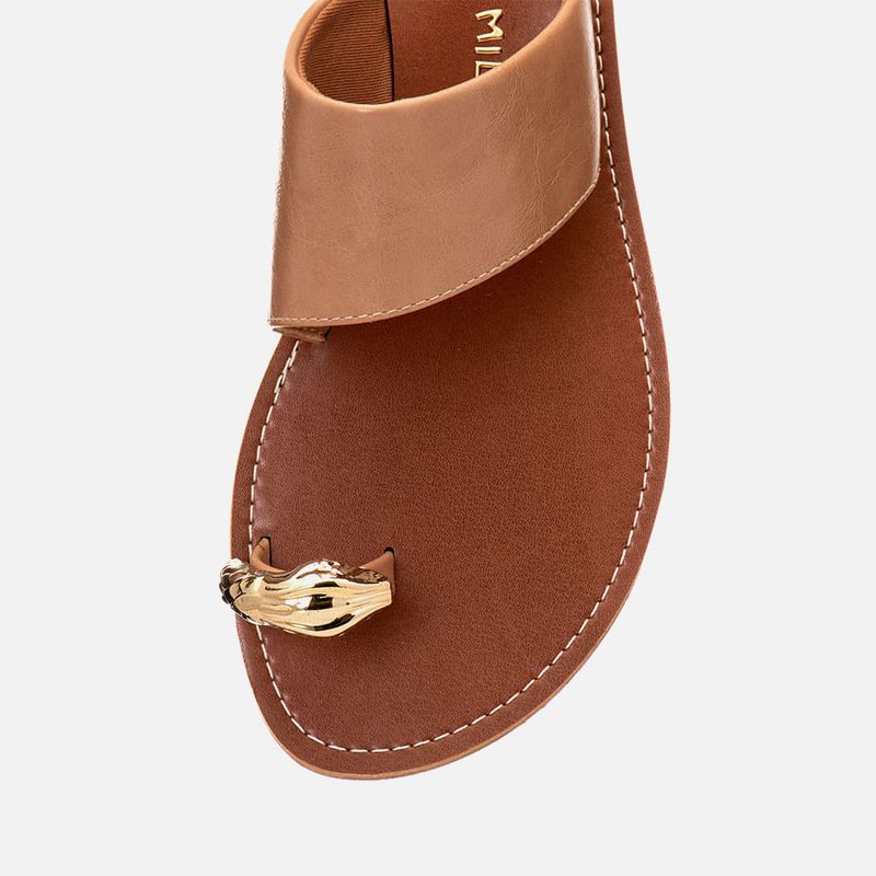 Sandália Rasteira com Ring Toe ou Anel de Dedo com Aplicação de Peça Metalizada com Formato de Cobra Dourada e Tira Larga na cor Bege. Com solado rasteiro com saltinho mínimo, laqueado em fusão de base nude com topo caramelo, palmilha revestida em napa em sobretom com detalhe em costura pesponto fazendo o contorno da sola, com traseira e bico arredondados, tira fina achatada em napa lisa dividindo o dedão com aplicação de peça com formato de cobra na cor dourada e tira larga sobre a base do tornozelo – esta tira sai mais larga da parte interna do pé e fica mais fina na parte externa. A rasteira é aberta na traseira de calce prático e a palmilha tem a marca Milano aplicada em etiqueta 3D na cor dourada.