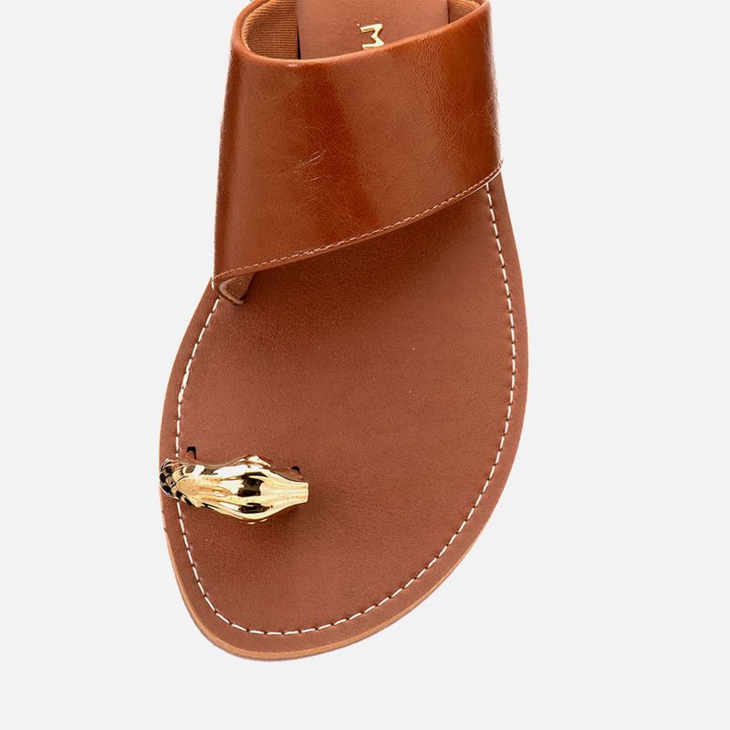 Sandália Rasteira com Ring Toe ou Anel de Dedo com Aplicação de Peça Metalizada com Formato de Cobra Dourada e Tira Larga na cor Caramelo. Com solado rasteiro com saltinho mínimo, laqueado em fusão de base nude com topo caramelo, palmilha revestida em napa em sobretom com detalhe em costura pesponto fazendo o contorno da sola, com traseira e bico arredondados, tira fina achatada em napa lisa dividindo o dedão com aplicação de peça com formato de cobra na cor dourada e tira larga sobre a base do tornozelo – esta tira sai mais larga da parte interna do pé e fica mais fina na parte externa. A rasteira é aberta na traseira de calce prático e a palmilha tem a marca Milano aplicada em etiqueta 3D na cor dourada.