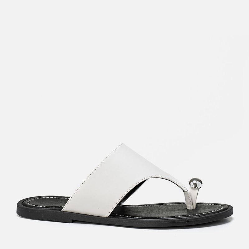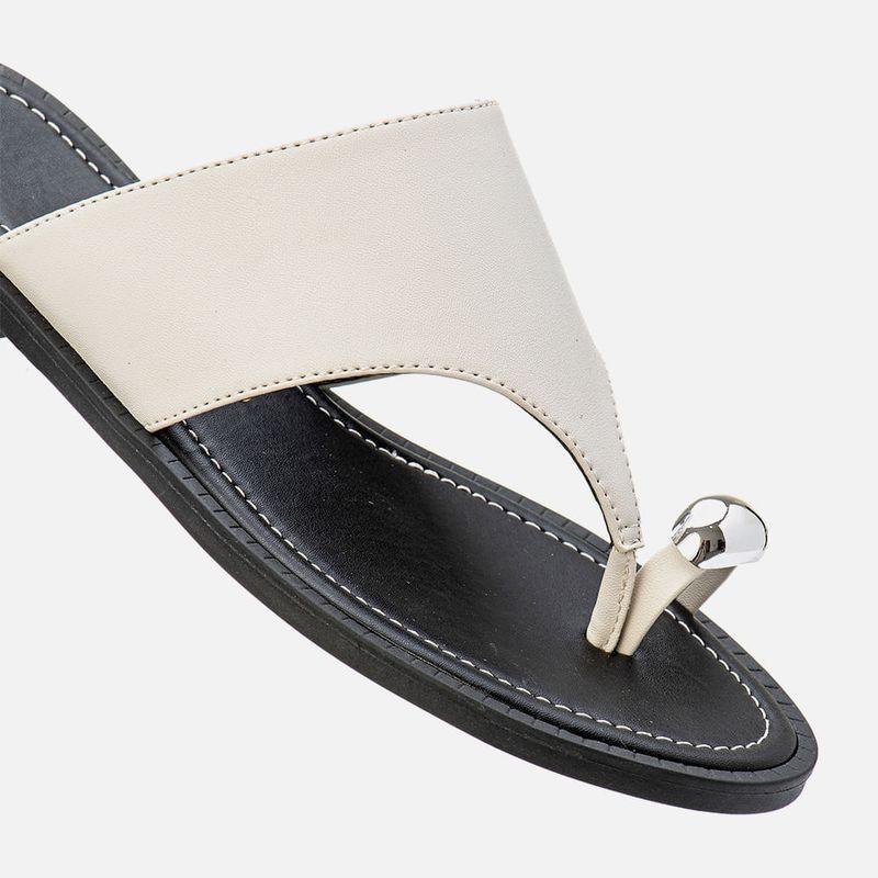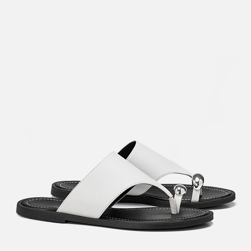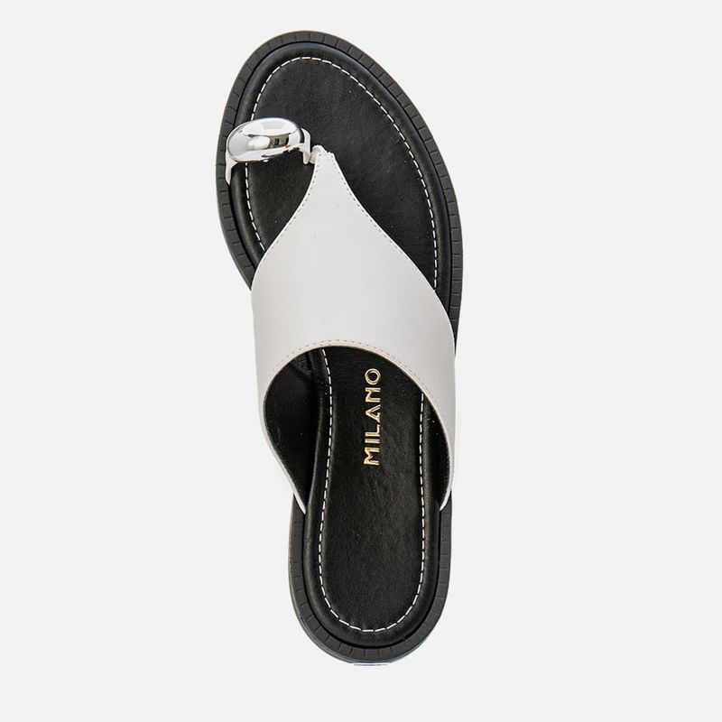Sandália Rasteira com Ring Toe, Tira Larga tipo Chinelo e Detalhe em Peça Orgânica na cor Branca com Palmilha Preta. Com solado rasteiro emborrachado na cor preta com saltinho mínimo e vira aparente com detalhe em vincos, palmilha macia encaixada também na cor preta com traseira e bico arredondados e detalhe em contorno feito em costura pesponto, tira ring toe na cor branca separando o dedão com detalhe em aplicação de peça orgânica cromada na cor dourada e tira dividindo os dedos fixada numa tira larga em formato de T tipo chinelo, fechando o modelo dos dedos até as laterais do peito dio pé. A marca Milano vai aplicada em etiqueta 3D na palmilha na cor dourada.