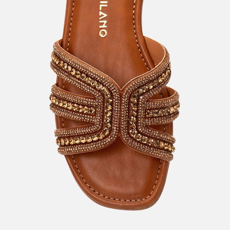 Sandália Rasteira com Tira Slide com Recortes na Lateral e Aplicação Brilho em Mix de Pedrarias Strass na cor Caramelo. Com solado emborrachado na cor café com saltinho mínimo embutido, palmilha encaixada super macia e acolchoada com detalhe em costura pesponto fazendo o contorno do formato, traseira e bico arredondados, tira larga tipo slide sob o peito do pé com recortes na parte central e laterais deixando pele à mostra com aplicação de brilho em mix de pedrarias sendo tiras de micro strass e strass redondos grandes em sobretom ao produto. A palmilha tem a marca Milano aplicada em etiqueta 3D na cor dourada.