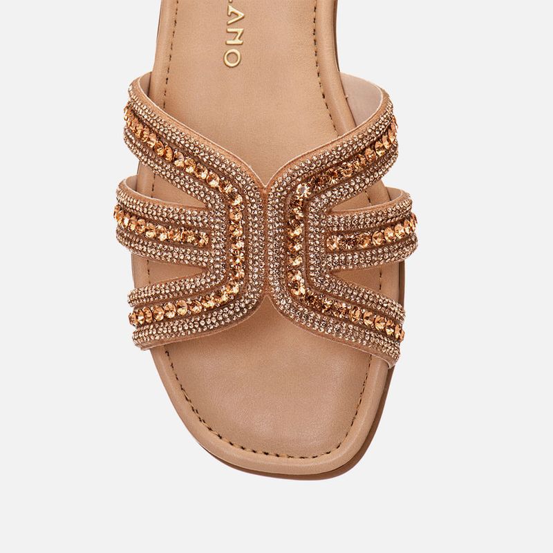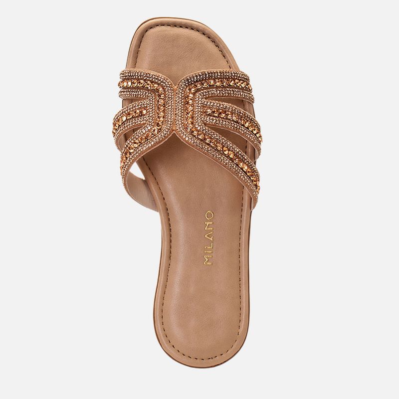 Sandália Rasteira com Tira Slide com Recortes na Lateral e Aplicação Brilho em Mix de Pedrarias Strass na cor Nude. Com solado emborrachado na cor café com saltinho mínimo embutido, palmilha encaixada super macia e acolchoada com detalhe em costura pesponto fazendo o contorno do formato, traseira e bico arredondados, tira larga tipo slide sob o peito do pé com recortes na parte central e laterais deixando pele à mostra com aplicação de brilho em mix de pedrarias sendo tiras de micro strass e strass redondos grandes em sobretom ao produto. A palmilha tem a marca Milano aplicada em etiqueta 3D na cor dourada.