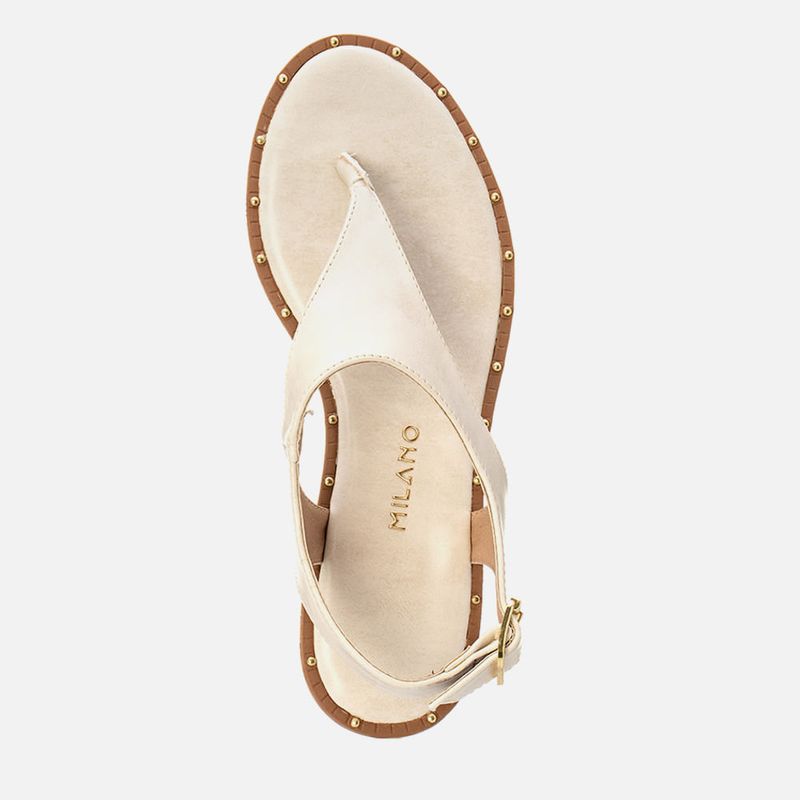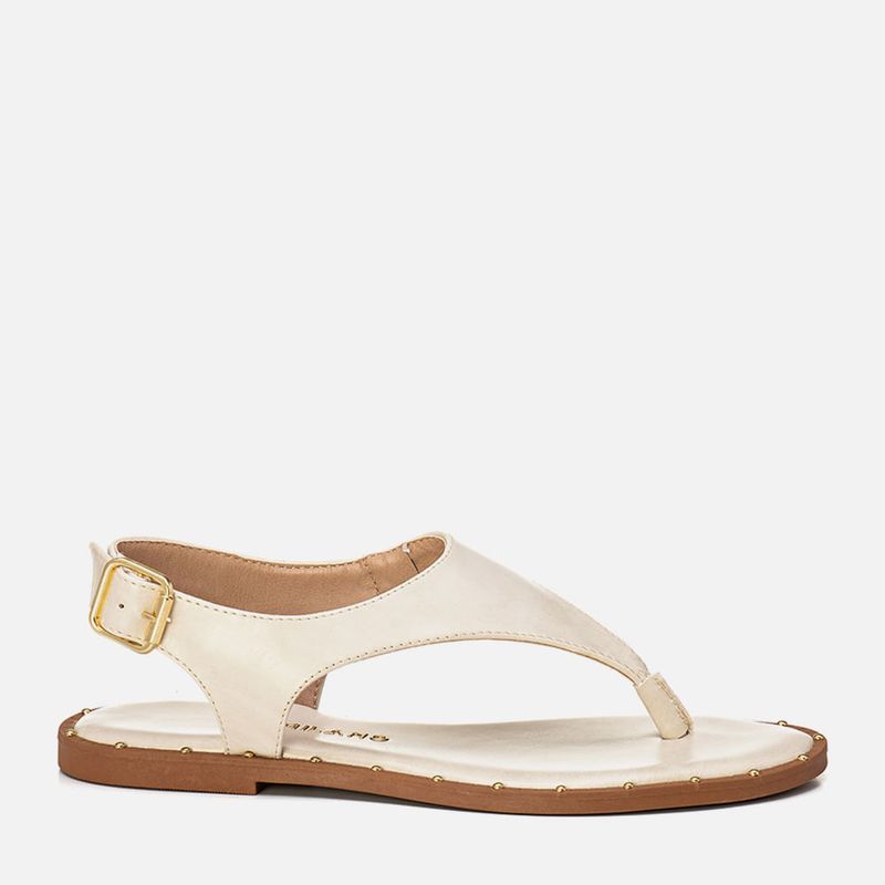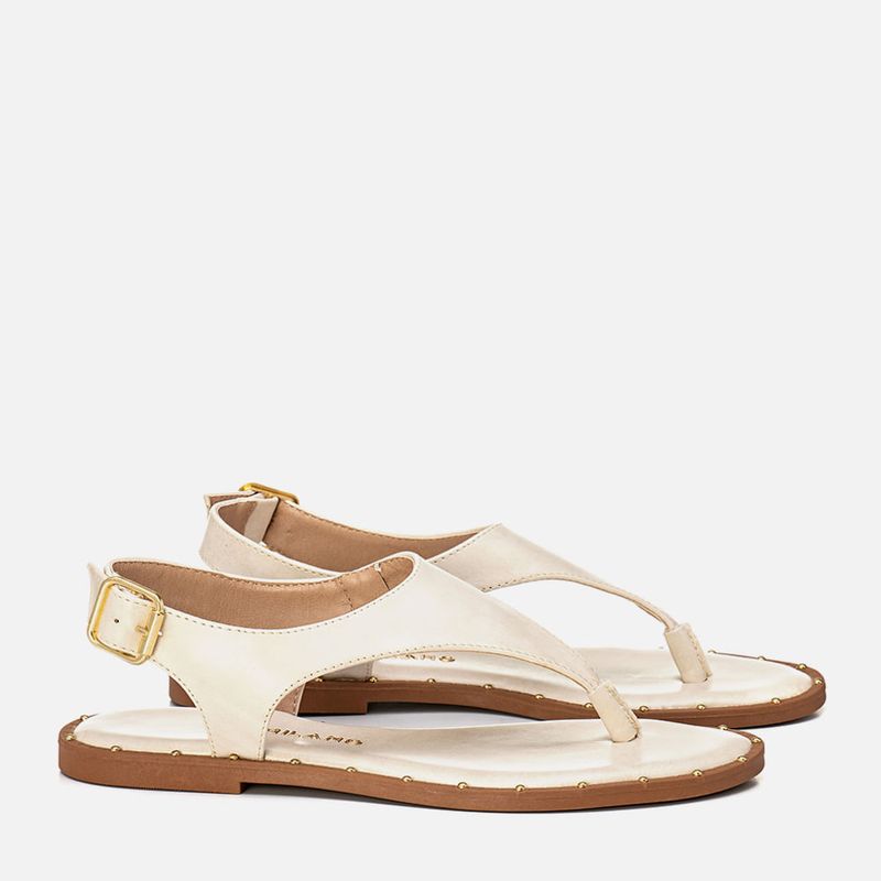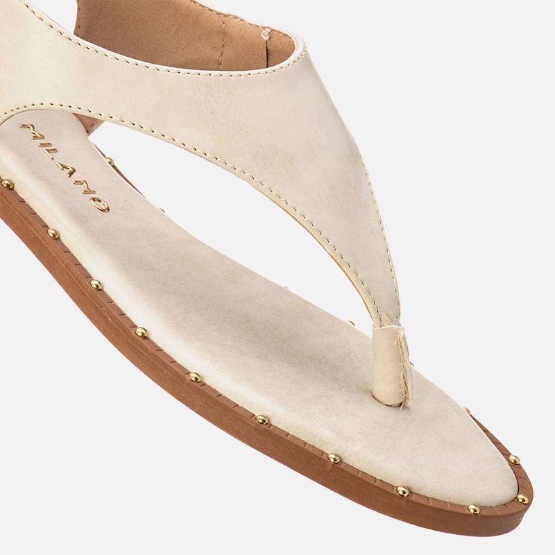 Sandália Rasteira Tipo Chinelo de Dedo em Estilo Boho em Peça Única com Rebites na Palmilha na cor Off White. Com solado emborracho com salto mínimo, detalhe em vira texturizada com rebites pintados na cor dourada, palmilha ultra macia, traseira e bico arredondados, tira em peça única dividindo os dedos – com proteção no mesmo material para o meio dos dedos deixando mais confortável, a tira é cruzada por todo o peito do pé sendo cruzada na traseira do calcanhar e fixa para sustentação nas laterais do tornozelo com estilo boho, o fechamento é feito com ajuste e regulagem do calce por maxi fivela em metal douradao na tira do calcanhar. A palmilha tem a marca Milano aplicada em etiqueta 3D na cor dourada.