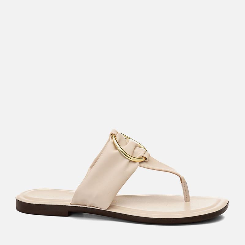 Sandália Rasteira tipo Chinelo Tira Macia em T com Detalhe em Argola Metal Dourado na cor Off White. Com solado emborrachado na cor marrom com saltinho mínimo, palmilha injetada diretamente na sola, tecnologia especial que evita descolamentos e garante maior durabilidade, esta tem ainda design conformado com dealhes em vincos acompanhando o formato do modelo, tira dividindo os dedos tipo chinelo, com proteção em vinil para maior conforto, esta sobe no centro do peito do pé abrindo levemente a largura da tira, fixada em outra tira larga que sai das laterais na base do tornozelo, esta tira é em material soft ultra macio com detalhe em enrugado, ambas as tiras são cruzadas em um elo central, feito em metal dourado, transpassado pela tira e fixado na tira do dedo. A palmilha tem a marca Milano aplicada em etiqueta 3D na cor dourada.