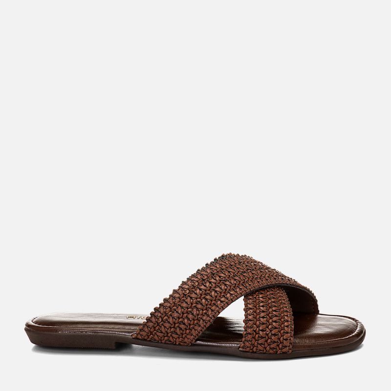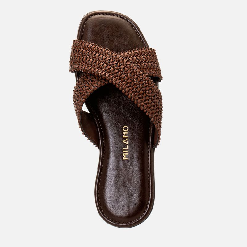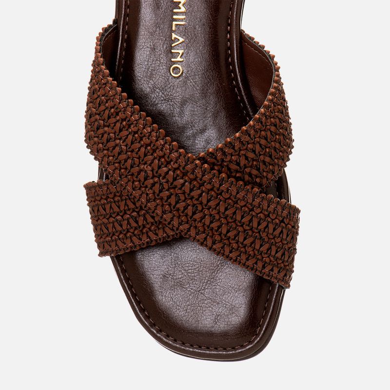 Sandália Rasteira com Tira Cruzada em X em Material Tramado Natural na cor Café. Com solado emborrachado na cor caramelo com saltinho mínimo embutido, palmilha encaixada super macia e acolchoada com detalhe em costura pesponto fazendo o contorno do formato, traseira e bico arredondados, duas tiras largas cruzadas em X no peito do pé feitas em material tramado natural tipo tressê palha com interior forrado em napa. A palmilha tem a marca Milano aplicada em etiqueta 3D na cor dourada.