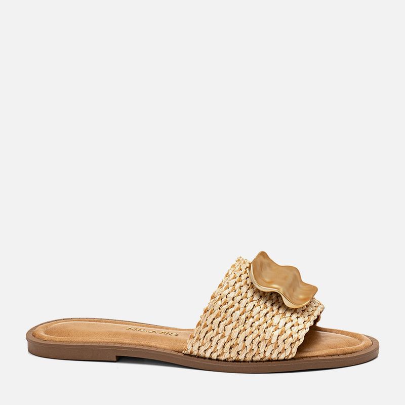 Sandália Rasteira com Tira Tramada Natural tipo Ráfia e Aplicação de Peça Metalizada Fosca com Formato Orgânico Dourada na cor Bege. Com solado emborrachado na cor caramelo com saltinho mínimo e vira oversize aparente com textura 3D, palmilha macia encaixada e revestida em napa lisa com traseira e bico arredondados com detalhe em costura pesponto fazendo o contorno da forma, tira larga tipo slide sobre os dedos e peito do pé feita em material tramado natural tipo ráfia com detalhes em palhas e linha dourada, possui ainda um aplique central em peça com formato orgânico tipo placa ondulada na cor dourada fosca. A flat é aberta na traseira de calce prático e a palmilha tem a marca Milano aplicada em etiqueta 3D na cor dourada.