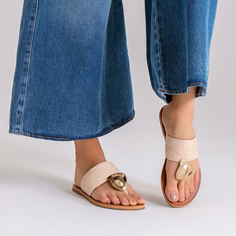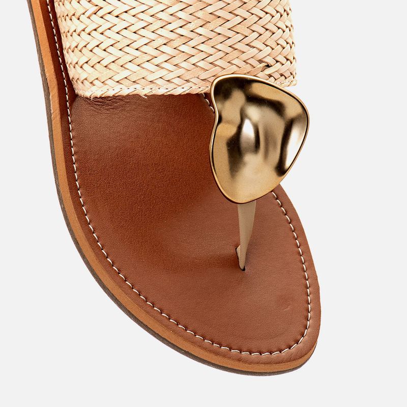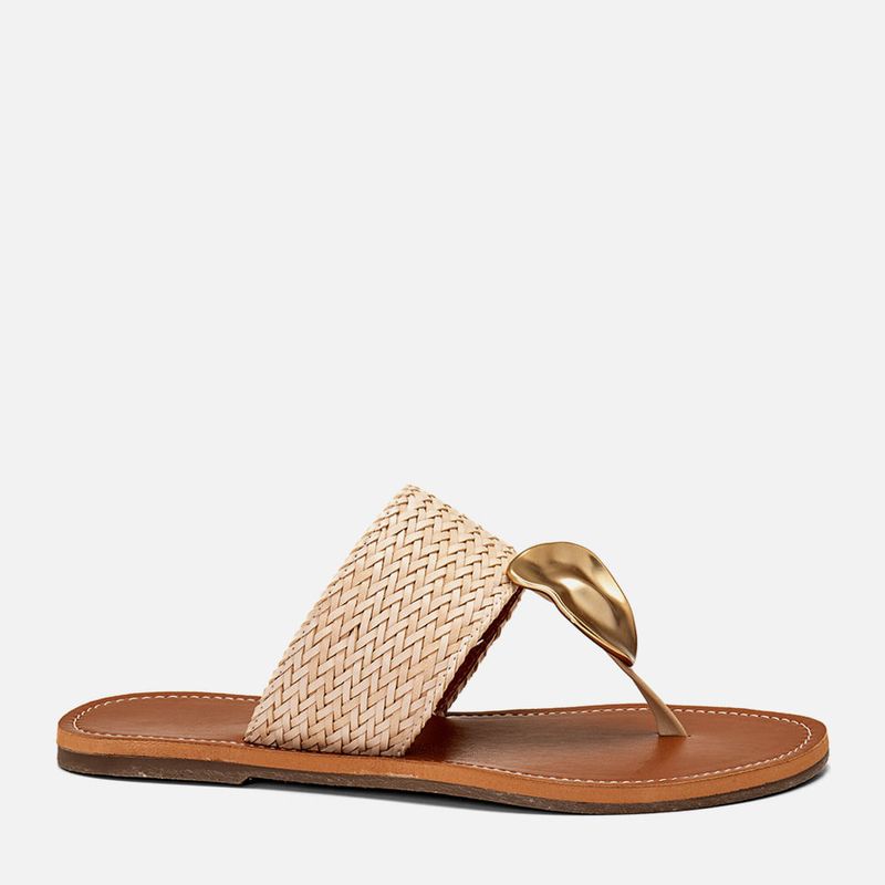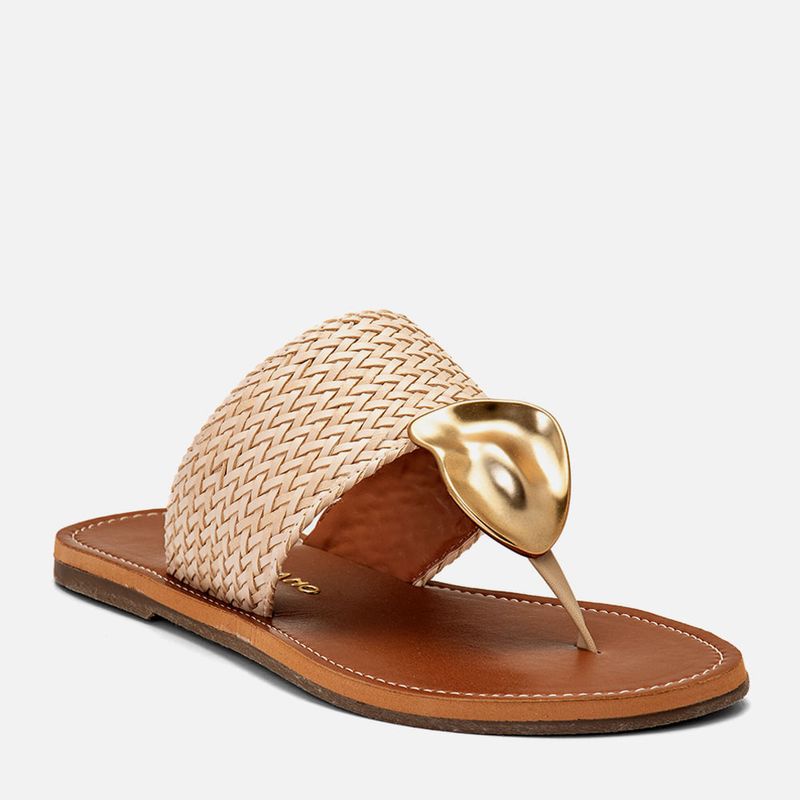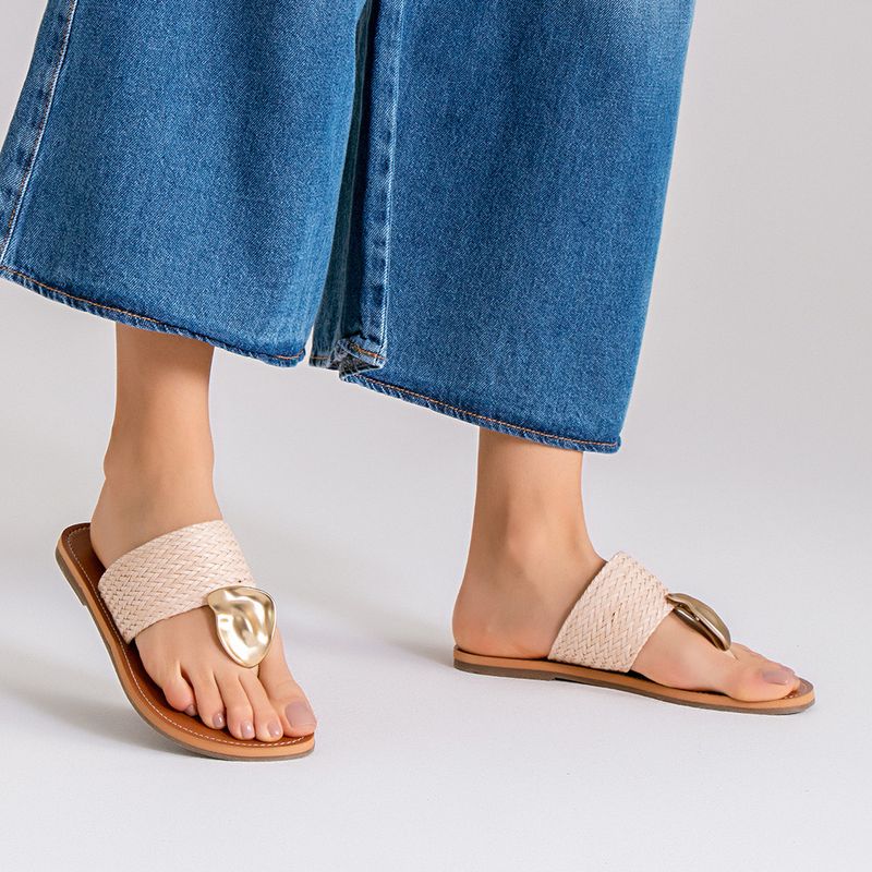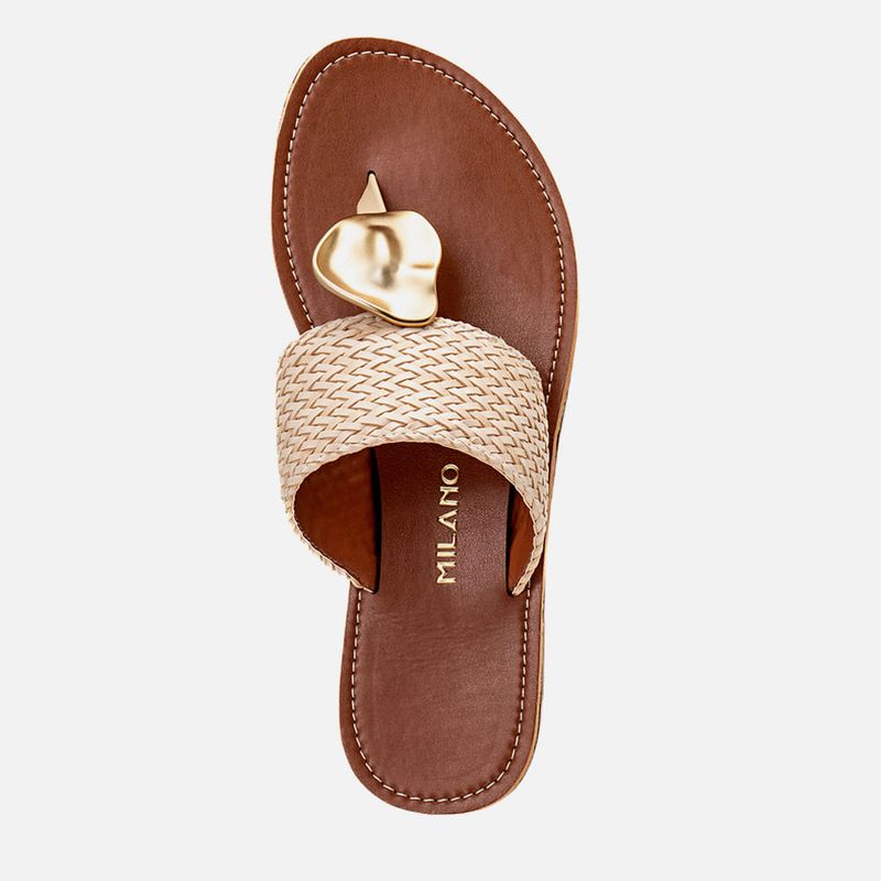 Sandália Rasteira com Tira Tramada em Trançado Tressê e Aplique de Peça Metalizada Fosca com Formato Orgânico na cor Off White. Com solado rasteiro laqueado bicolor, palmilha com formato arredondado revestido em napa na cor nude e detalhe em costura pespontada, tira dividindo os dedos, no dedão do pé, com aplicação em peça com formato orgânico metalizado dourado fosco, tira larga sobre o peito do pé feita em material tramado em trançado, tipo tressê, revestido na parte interna também em napa na cor nude. A marca Milano vai aplicada na palmilha em etiqueta 3D na cor dourada.