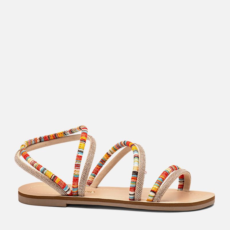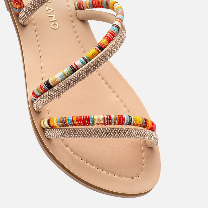 Sandália Rasteira com Tiras Estruturadas em Mix de Brilho em Manta de Strass e Tira tipo Corda Tramada Multicolorida com Calce Prático na cor Nude. Com solado rasteiro com saltinho mínimo, laqueado em fusão de base nude com topo caramelo, palmilha revestida em napa em sobretom com detalhe em costura pesponto fazendo o contorno da sola, traseira e bico arredondados, grupo de tiras duplas estruturadas, sendo: uma com aplicação de brilho em manta de strass em sobretom e a outra revestida tipo corda tramada multicolorida, deixando o visual divertido e descolado, as tiras são: duas sobre os dedos, duas em diagonal sob o peito do pé e mais duas saindo das laterais do tornozelo e cruzadas fazendo o fechamento por calce prático sem amarrações. A palmlilha tem a marca Milano aplicada em etiqueta 3D na cor dourada.