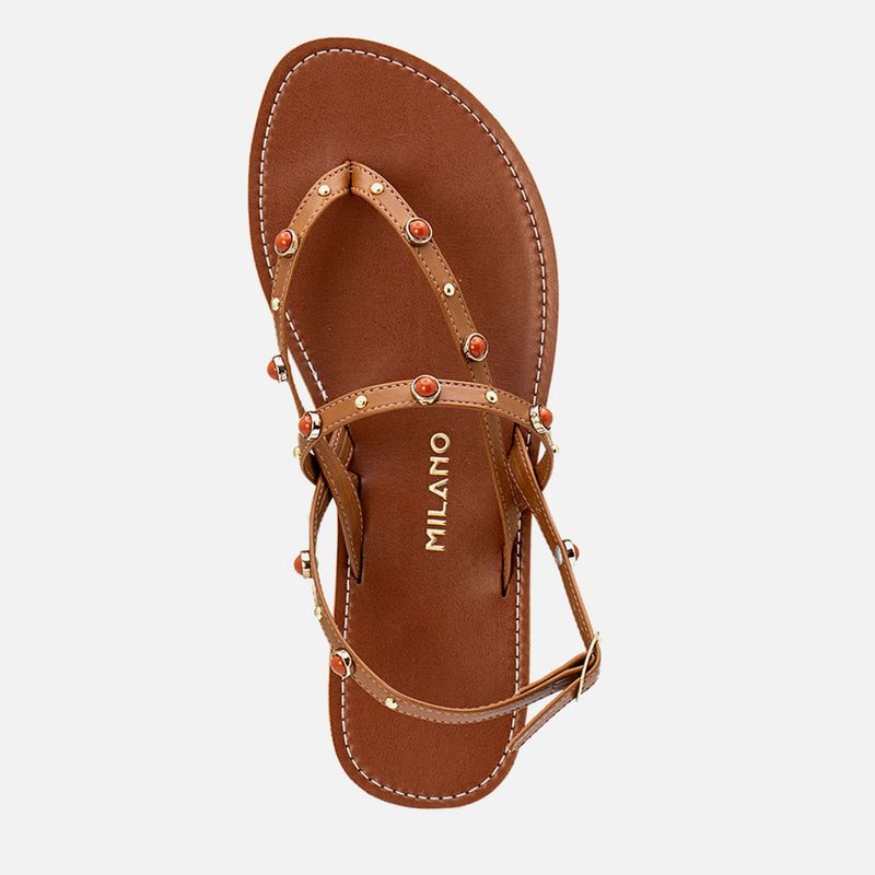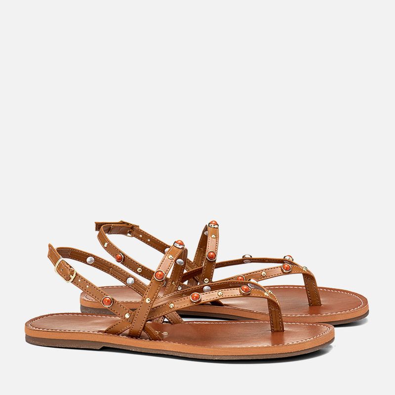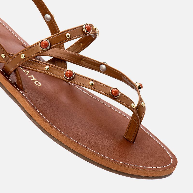 Sandália Rasteira de Dedo com Tiras Finas e Aplicação de Mix de Metais Dourados Esfera e mini Rebites na cor Caramelo. Com solado rasteira laqueado bicolor, pequeno salto, palmilha com detalhe em costura pesponto, tira dividindo os dedos (tipo chinelo) e cruzadas em diagonal até a lateral do tornozelo, base do tornozelo e traseira do calcanhar com aplicação de mix de metais sendo um metal dourado com aplicação de meia esfera laranjas e mini rebites dourados, com fechamento e ajuste do calce por fivela. A marca Milano vai aplicada na palmilha em etiqueta 3D na cor dourada.
