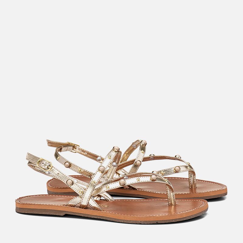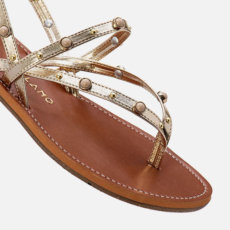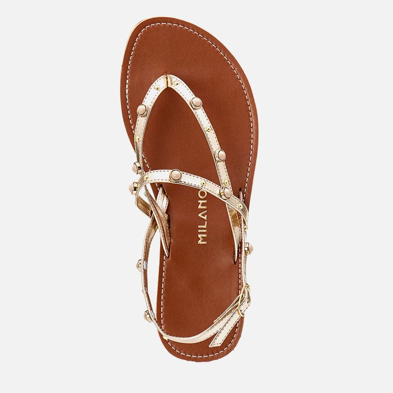 Sandália Rasteira de Dedo com Tiras Finas e Aplicação de Mix de Metais Dourados Esfera e mini Rebites na cor Ouro Light. Com solado rasteira laqueado bicolor, pequeno salto, palmilha com detalhe em costura pesponto, tira dividindo os dedos (tipo chinelo) e cruzadas em diagonal até a lateral do tornozelo, base do tornozelo e traseira do calcanhar com aplicação de mix de metais sendo um metal dourado com aplicação de meia esfera nude e mini rebites dourados, com fechamento e ajuste do calce por fivela. A marca Milano vai aplicada na palmilha em etiqueta 3D na cor dourada.