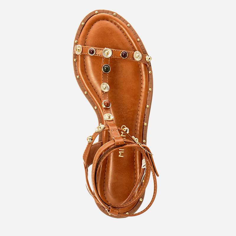 Sandália Rasteira de Tiras Finas Estilo Gladiadora com Aplicações em Metal de Tachas ou Studs tipo Rebite, Pedrarias Multicolor em Meia Esferas na cor Caramelo. Com solado emborracho com salto mínimo, detalhe em vira texturizada com rebites pintados na cor dourada, palmilha ultra macia na cor preta com detalhe em contorno do formato em costura pesponto, tiras finas achatadas sobre os dedos fixada em tira que atravessa o do peito do pé e unida em tira sobre a base do tornozelo, ambas as tiras possuem aplicações de mix de tachas, ou studs, sendo rebites com formato diferenciado na cor dourada e metal arredondado com meia esfera em pedraria de resina em tons multicolor, o fechamento é feito por tira cruzada no calcanhar de onde tem passador para as tiras duplas cruzadas no tornozelo com ajuste e regulagem do calce por fivela – essa tira cruzada em estilo amarração gladiadora não tem aplicações. A palmilha tem aplique macio com costura pesponto e a marca Milano aplicada em etiqueta 3D na cor dourada.