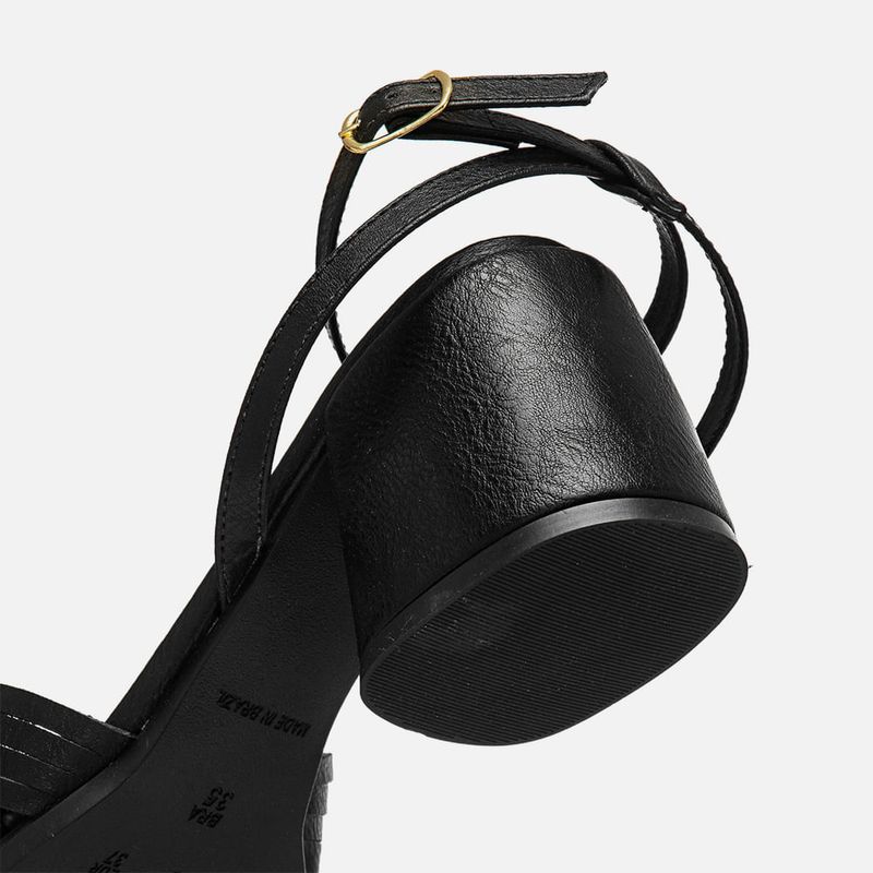 Sandália Salto Alto Bloco Arredondado Cortiça Natural Estilo Boho com Tiras Recortadas e Trançadas e Peça Metalizada com Formato Orgânico Dourada na cor Preto. Com solado emborrachado na cor caramelo sob o salto e parte frontal da palmilha com formato oversize tipo vira aparente, tira tipo slide sob os dedos em peça dupla com formato arredondado e recorte tipo tiras fininhas na parte interna, unidas centralmente por uma tira trançada no mesmo material com detalhe no topo sob o peito do pé em peça metalizada com formato orgânico, o fechamento é feito por tira fina achatada que sai da lateral do tornozelo cruza a traseira e depois a frente do tornozelo com fivela para ajuste e regulagem do calce. A palmilha tem aplique macio na cor nude com a marca Milano aplicada em etiqueta 3D na cor dourada.