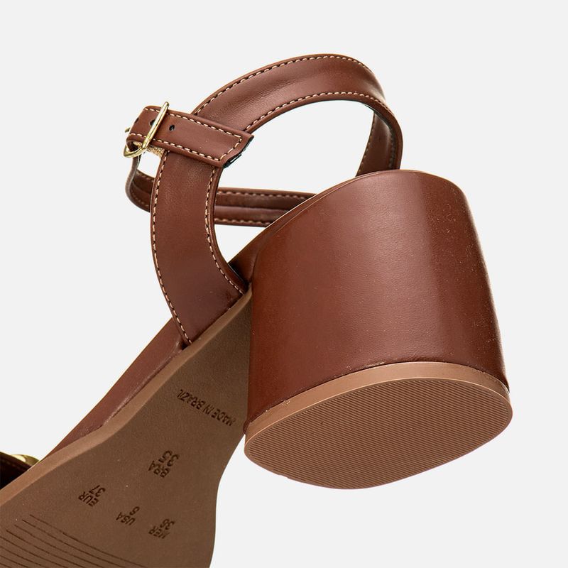 Sandália Salto Alto Bloco Geométrico Encaixado com Bico Quadrado e Aplicações em Metal Tachas Pedrarias Estilo Boho na cor Marrom. Com solado emborrachado na cor caramelo sob o salto bloco médio com formato geométrico trapézio com cantos arredondados, palmilha encaixada com traseira arredondada e bico quadrado – o solado da parte frontal tem formato oversize no estilo vira aparente, tira média achatada sobre os dedos com aplicação de tachas, ou studs, estilo boho em peça metálica arredondada na cor dourada com aplicação de pedrarias em resina tipo meia esfera no mesmo tom do produto, uma tira saindo da lateral do tornozelo e cruzada no calcanhar com tira frontal mais fina para fechamento com ajuste e regulagem do calce por fivela - as tiras tem acabamento em costura pesponto no contorno do formato. A palmilha tem aplique macio no mesmo tom do produto com a marca Milano aplicada em etiqueta 3D na cor dourada.