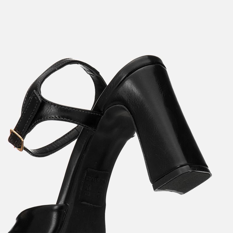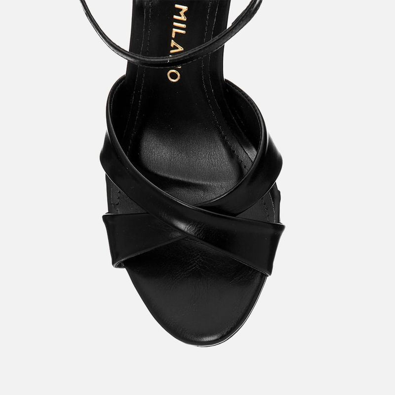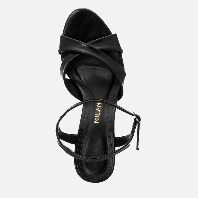 Sandália Salto Alto Bloco Geométrico Flare com Tiras Cruzadas em X e Bico Redondo na cor Preto. Com solado emborrachado na cor caramelo, na base do salto e em toda palmilha, salto alto bloco revestido tipo flare – com a base mais larga, palmilha encaixada com traseira e bico arredondados, tiras média achatadas cruzadas em X sobre os dedos e peito do pé - na parte central onde se encontram as tiras são mais finas, e duas tiras saindo das laterais e cruzadas no tornozelo fazendo o fechamento por fivela, que permite o ajuste e regulagem do calce. A palmilha tem aplique macio em tom nude com detalhe em costura pesponto e a marca Milano aplicada em etiqueta 3D na cor dourada.