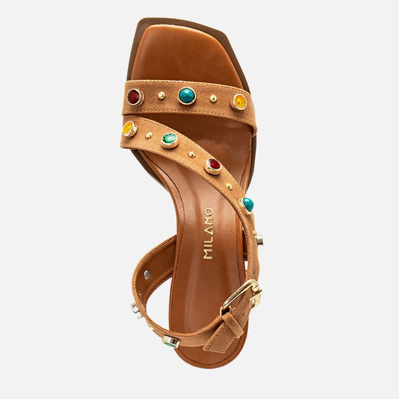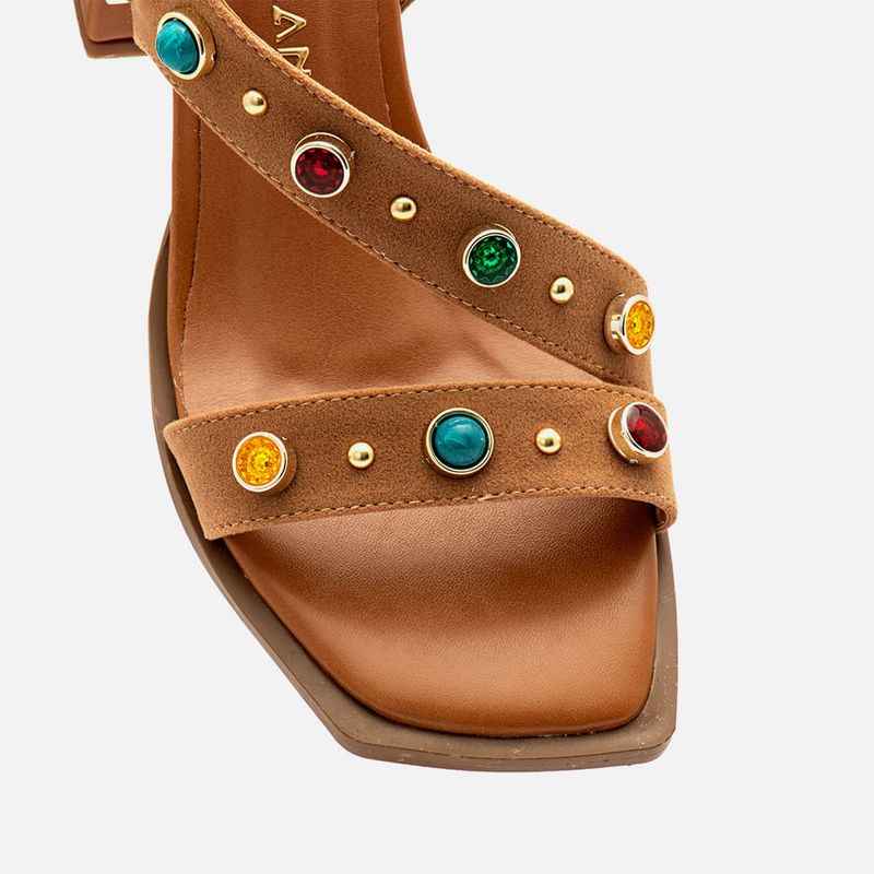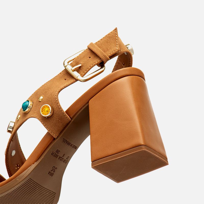 Sandália Salto Alto Bloco Trapézio Tiras Médias com Aplicação em Mix de Metais e Tachas Boho Multicolor na cor Caramelo. Com solado emborrachado na cor caramelo – sob o salto e parte frontal da palmilha com vira aparente, palmilha encaixada revestida em napa lisa com traseira arredondada e bico quadrado, grupo de tiras achatadas médias com aplicação em mix de metais e tachas/studs, no estilo Boho, sendo: metal arredondado dourado com pedraria em resina de esfera e também em strass redondo ambos multicolor, e mini rebites também em dourado, as tiras são em material aveludado tipo camurça sendo: uma sobre os dedos, uma cruzada em diagonal no peito do pé e fixada em uma tira na lateral do tornozelo e depois cruzada no calcanhar, essa tira possui maxi fivela quadrada em metal para fechamento e ajuste de regulagem do calce. A palmilha tem a marca Milano aplicada em etiqueta 3D na cor dourada.